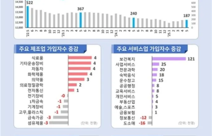 5월고용보험상시가입자수증가폭은5년만에최저(서울=연합뉴스)김은경기자=지난달구직자1인당일자리수인구인배수가국제통화기금(IMF)외환위기의영향을받은1998년이래27년만에5월기준가장낮은수준을기록했다.고용보험상시가입자수증가폭은2020년5월이후5년만에최저였다.9일고용노동부가발표한'고용행정통계로본노동시장동향'에따르면5월말기준고용보험상시가입자는1천558만명으로지난해같은달보다18만7천명(1.2%)증가했다.2020년5월(15만5천명)이후5년만에가장낮은증가폭이다.업종별로보면제조업과서비스업은증가했으나,건설업은감소했다.제조업가입자수는385만명으로식료품,기타운송장비,자동차,화학제품등을중심으로늘었지만섬유,금속가공,고무·플라스틱등은줄었다.고용허가제외국인당연가입증가분을빼면제조업분야에서1만6천명이줄어든것으로,제조업내국인가입자감소세는20개월째이어졌다.서비스업의경우가입자수가1천82만명으로보건복지,사업서비스,전문과학,숙박음식,운수창고등위주로증가했으나,도소매·정보통신은지속감소했다.건설업가입자수는75만4천명으로종합건설업을중심으로22개월연속줄었다.성별로보면남성가입자는857만6천명으로1년전과비교해3만9천명,여성가입자는700만3천명으로14만8천명각각증가했다.30대,50대,60세이상은각각7만3천명,5만4천명,19만명증가한반면29세이하와40대는인구감소등영향으로각각9만3천명,3만7천명감소했다.29세이하와40대는각각35개월,21개월연속줄었다.외국인력도입확대등으로전체업종외국인가입자는1년전보다2만2천명증가한25만6천명으로집계됐다.5월구직급여(실업급여)신규신청자는8만5천명으로작년같은달보다3천명(3.1%)감소했다.구직급여지급자는67만명으로작년동월대비2만4천명(3.7%)늘었다.구직급여지급액은1조1천108억원으로322억원(3.0%)증가했다.올해구직급여예산은10조9천171억원으로,5월까지5조3천663억원이지급돼벌써예산절반가량이소진됐다.이는지난해같은기간지급된5조37억원보다7.2%늘어난수치다.천경기노동부미래고용분석과장은"통상적으로볼때구직급여신규신청은1월,7월등분기가끝난다음달과3월에많이들어온다"며"그이후에는낮아져6월부터는1조원아래로떨어지는경향을보인다"고설명했다.그는"지급인원의증가세는2019년지급기간을최대270일로확대하면서늘어난신청수가계속영향을주는것으로분석된다"며"월별신규신청증감을보면작년10월이후부터는올해1월을제외하고모두신규신청이늘어지급액의상승압력이커지는상황"이라고부연했다.고용서비스통합플랫폼'고용24'를이용한신규구인인원은14만1천명으로지난해같은달보다4만6천명(24.8%)감소했다.이는2023년3월부터27개월연속감소한것이다.신규구직인원은37만6천명으로1만명(2.6%)늘었다.구직자1인당일자리수인구인배수는0.37로전년동월(0.51)보다낮았다.이는1998년5월0.32이후가장낮은수준이다.천과장은"2024년11월18만9천명증가후둔화하던고용보험가입자증가폭이1월저점을찍은후소폭회복하는모습"이라면서도"연구기관전망등에따르면상반기에는(고용회복추세가)지속할수있을것으로보이지만,하반기부터는어려워질것같다"고내다봤다.그는"산업환경의영향으로제조업과건설업등이어려운가운데서비스업중심으로일자리가그나마늘고있다"며"일자리의구조변화가지속되는것"이라고부연했다[email protected]▶제보는카톡okjeboCopyright©연합뉴스.무단전재-재배포,AI학습및활용금지