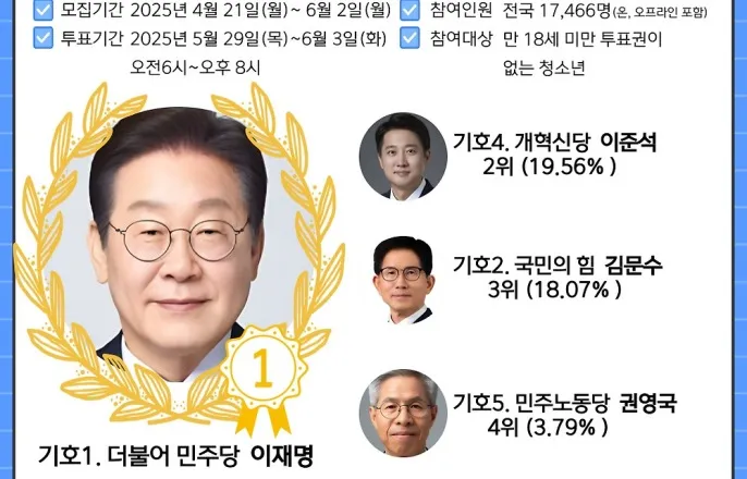제21대대통령선거비유권자청소년모의투표...2위는이준석,3위는김문수,4위는권영국[이영일기자]▲투표권이없는전국청소년들이실시한제21대대통령선거청소년모의투표에서이재명더불어민주당후보가51.64%로1위를차지했다.ⓒ한국YMCA전국연맹투표권이없는전국청소년들이실시한제21대대통령선거청소년모의투표에서더불어민주당이재명후보가당선자로선출됐다(관련기사:"비상계엄이청소년들을깨우다"...표없는청소년들의유쾌한'선거',https://omn.kr/2dz6h)청소년YMCA전국대표자회와한국청소년정책연대,한국YMCA전국연맹은전국17개시도198개시군구에서만17세이하청소년선거인단1만7466명이참여한가운데청소년모의투표를실시했다.그결과이재명더불어민주당후보가51.64%로1위를차지했다.이준석개혁신당후보가19.56%차지했다.3위로는김문수국민의힘후보가18.07%를,4위는권영국민주노동당후보가3.79%로를득표했다.실제개표결과로는김문수후보가2위를차지하고있는데청소년들은2위로이준석후보를꼽았다.▲6.3제21대대통령선거청소년모의투표전국개표결과.ⓒ한국YMCA전국연맹이번청소년모의투표는전국17개시도에서70개의오프라인투표소와온라인을통해동시진행됐다.온라인플랫폼에서각정당대통령후보자들과정당의청소년정책및공약에대한질의응답을진행한것이청소년들의투표에도움을준것으로분석된다.시도별,시군구별투표결과는온라인플랫폼(www.18vote.or.kr)결과보기를통해공개될예정이다.김진곤한국YMCA전국연맹청소년국장은"이번청소년모의투표는대한민국역사상두번째대통령탄핵이라는중대한시기에진행돼청소년들이정치적주체로서성숙하게성장할수있는중요한계기가됐다"고모의투표결과를설명했다.김국장은"세계적으로도미국,독일,캐나다,스웨덴,일본등선진민주주의국가에서는이미청소년모의투표를민주시민교육의핵심적정책으로제도화하여운영하고있다.이는청소년들이민주주의의가치를내면화하고적극적인정치참여의식을함양할수있도록지원하는성공적인모델"이라며"청소년역시자신의삶과미래에관한중요한결정에목소리를낼권리가있다"고강조했다.청소년들이선정한제21대대통령당선인에게는전국청소년모의투표대표단이청소년정책을정리해직접대통령당선증과함께전달할예정이다.Copyright©오마이뉴스.무단전재및재배포금지.