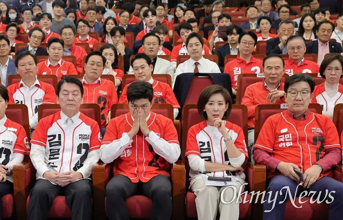 [현장]12.4%p격차대패예측에얼어붙은국힘개표상황실...주요당직자들자리떠[박수림,유성호기자]▲3일서울여의도국회도서관에마련된국민의힘개표상황실에서선대위원장들이제21대대통령선거방송3사출구조사결과를보고있다.(왼쪽부터)양향자,안철수,김용태,나경원,권성동.ⓒ공동취재사진"민주당이재명51.7%,국민의힘김문수39.3%로예측됐습니다."3일오후8시국민의힘대통령선거개표상황실이마련된국회도서관대강당.힘찬카운트다운에이어KBS,MBC,SBS등지상파방송3사출구조사결과가발표되자긴시간침묵이흘렀다.빨간선거운동복을입고모여앉은국민의힘의원들은굳은표정으로멍하니TV화면을응시했다.출구조사에서김문수국민의힘대선후보가이재명더불어민주당대선후보에12.4%p뒤지는결과가나오자김용태비상대책위원장은답답한듯두손으로마른세수를했다.앞서김위원장은결과발표전취재진과만나"추세가상승세"라며"좋은결과를기대하고있다"고밝힌바있다.권성동원내대표는잠시머리를긁적였고,안철수선거대책위원회공동선거대책위원장의얼굴은붉어졌다.그옆에있던나경원공동선대위원장도턱에손을괴고가만히화면을응시하기만했다.위로주고받은국힘관계자들..."아직개표전,기적한번일어나길"▲권성동원내대표겸공동선대위원장과김기현공동선대위원장이3일서울여의도국회도서관에마련된국민의힘개표상황실에서제21대대통령선거방송3사출구조사결과를지켜보다자리를떠나고있다.ⓒ공동취재사진곧이어지역별출구조사결과발표가이어졌다.김문수후보는부산·대구·경북에서만앞섰고,울산·경남·강원에서는이후보와접전이예상됐다.이후보는그외모든지역에서1위를달렸다.미리언론인터뷰를약속했던나경원공동선대위원장은착잡한표정으로"괜히인터뷰한다고그랬다"라고말하기도했다.권성동원내대표등은출구조사결과발표11분만에자리를떴다.현장을찾은관계자들일부는"아직개표안했으니까기적이한번일어나기를바라야지""샤이보수가있을수있어"라는말로서로위로를주고받기도했다.한동안자리를지키던김용태비대위원장은40분쯤지나자리에서일어나밖으로향했다.김위원장은'출구조사결과를어떻게봤냐'는취재진의말에"(개표상황)진행중이니까겸허하게지켜보겠다"고짧게답한뒤차를타고비대위원장실로이동했다.▲김용태(앞줄오릉쪽)국민의힘비상대책위원장과안철수공동선대위원장이9일서울여의도국회도서관에마련된국민의힘개표상황실에서제21대대통련선거방송3사출구조사결과를지켜본뒤자리를지키고있다.ⓒ공동취재사진Copyright©오마이뉴스.무단전재및재배포금지.