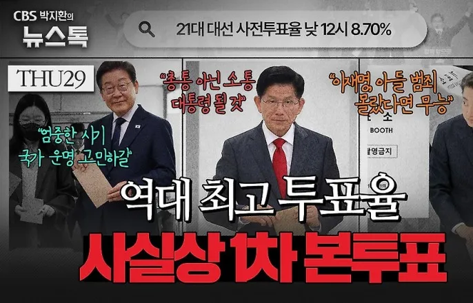 CBS박지환의뉴스톡■방송:CBS라디오'박지환의뉴스톡'■채널:표준FM98.1(17:30~18:00)■진행:박지환앵커■패널:정치부이은지기자[앵커]제21대대통령선거사전투표가오늘(29일)부터시작됐습니다.본투표는닷새뒤인6월3일이지만사실상1차본투표에들어갔다고봐야할텐데요.내일(30일)까지진행되는사전투표는이번대선결과를가늠할바로미터가될수있다는점에서정치권도촉각을곤두세우고있습니다.자세한내용,국회출입기자연결해서들어보겠습니다.이은지기자.[기자]네,국회입니다.[앵커]네이기자.지금도퇴근하고투표소로향하시는분들계실텐데요.사전투표관련현황먼저전해주시죠.[기자]네,앞서말씀하신대로6·3대선사전투표가오늘오전6시전국3568개사전투표소에서일제히시작됐습니다.오후6시마감인사전투표는내일까지이틀에걸쳐이뤄집니다.본투표와는달리,별도신고없이가까운사전투표소어디서나투표가가능합니다.중앙선거관리위원회에따르면,오늘오후5시기준사전투표율은17.51%로전체유권자4439만1871명중777만1218명이투표를마친것으로집계됐습니다.지난2022년20대대선당시동시간대투표율대비1.67%p높은수치인데요.이는이번조기대선에서'꼭투표하겠다'는유권자비율이직전선거보다높아졌다는중앙선관위의조사와도통하는결과입니다.선관위가지난24~25일한국갤럽에의뢰해전국18세이상유권자1512명을대상으로실시한'2차유권자의식조사'에따르면,유권자의86.8%는'반드시투표할것'이라고응답한것으로나타났습니다.'적극투표의향'을밝힌유권자비율이3년전83%보다4%p가까이오른겁니다.전화면접조사방식으로진행된이조사의오차범위는95%신뢰수준에±3.1%p로,자세한내용은중앙여론조사심의위원회홈페이지를참고하면됩니다.[앵커]네실제로도현장투표열기가매우뜨거웠다고하는데요.이부분은사전투표소현장을취재한사회부송선교기자리포트로들어보고,다시이기자와이야기나눠보겠습니다.더불어민주당이재명대선후보가29일서울송파구잠실종합운동장광장에서열린강동구·송파구집중유세에서기표모양이그려진야구공을들고있다.연합뉴스<리포트>오늘오전9시서울강남구역삼동의한사전투표소앞에는100명이넘는유권자들이길게줄을섰습니다.투표소안에서부터이어진유권자행렬이밖으로도수십미터이어진겁니다.이같은사전투표열기는동시간대역대최고치의투표율로나타나고있습니다.오후5시기준전국평균사전투표율은17.51%에달합니다.투표소에서만난시민들도이렇게사람이많이몰릴줄은예상하지못했다고말했습니다.[인서트:유권자A씨]"점심시간이나이럴때좀많을줄…오전인데이렇게많을줄은…깜짝놀랐어요."길게는20분가량기다린끝에유권자들은새대통령에대한저마다의희망을담아소중한한표를행사했습니다.[인서트:시민들]"갈등이라는말을쓰기가어려울정도로사실저열한일이좀많았다고생각하고요.소외된사람들한테많이빛이갈수있는정책이좀많아졌으면좋겠네요.""조금더열심히,그중소기업들을위해서힘써주셨으면좋겠습니다.소상공인들이요즘너무어렵고…"곳곳의사전투표소에는오후에도시민들의발걸음이끊이지않았습니다.27도가넘는더운날씨에도직장인들은한손에커피를들거나휴대용선풍기를들고투표소를찾았습니다.한편일부투표소에서는내부공간이부족해시민들이투표용지를받은뒤바깥으로나가는일이벌어져선관위가정확한사실관계조사를진행중입니다.CBS뉴스송선교입니다.김문수국민의힘대선후보가외동딸동주씨와함께29일오전인천계양1동주민센터에서제21대대통령선거사전투표를하고있다.황진환기자[앵커]네이사전투표율이최종투표율에미치는영향도지켜봐야할거같은데요.이은지기자,지금주요대선후보들도오늘투표를이미다마친거죠?[기자]네,먼저이재명민주당대선후보는대학들이밀집한서울서대문구신촌에서청년들과함께한표를행사했는데요.이후보는"투표는우리대한민국주권자들의주권을행사할수있는가장확실한수단"이라고강조하며,"본투표일에무슨일이생길지모르니미리해두는게낫지않겠냐"고사전투표를독려했습니다.반면김문수후보는오늘이재명후보의지역구인인천계양구에서사전투표에나섰습니다.당이'인천상륙작전:대역전의서막'이라는슬로건을붙인일정인데요.김후보는"자유가넘치는대한민국,민주주의가꽃피는조국을지켜야한다"며'1번',즉이재명후보를찍으면자유가없어진다고강조했습니다.또개혁신당이준석후보와의단일화에대해서는마지막까지여지를열어뒀습니다.이재명후보와김문수후보의음성,차례로들어보시겠습니다.[인서트:더불어민주당이재명후보,국민의힘김문수후보]"총알보다투표가강하다란말이있습니다.이번내란사태도우리국민들의투표참여만으로비로소이겨낼수있습니다.""저는마지막까지도계속노력하겠습니다.전체적으로하나로뭉치기위해서노력을계속하고있는중입니다."[앵커]네.이재명,김문수후보음성을들어보니사전투표자체가유세인듯한느낌이네요.TV토론발언으로후폭풍이거센이준석후보는오늘도사과를하긴했다고요?[기자]네,이준석후보는지난27일마지막TV토론당시여성의신체부위를언급한성폭력성발언으로뭇매를맞고있는데요.오늘국회에서기