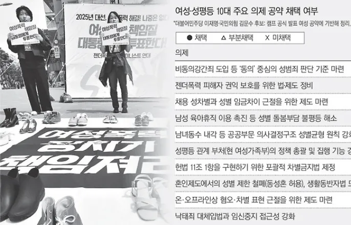 (하)‘10대성평등의제’후보4인의응답약열흘앞으로다가온제21대대선은유독여성·성평등의제가전면에드러나지않는다는평가를받는다.성평등실현은더는‘차후과제’로미룰수있는상황이아니다.지난달발표된2023년도기준국가성평등지수는2010년첫측정이래처음으로하락했다.그간완만하게나마성평등지표가개선돼왔던추세가뒤집혔다는뜻이다.시민사회의요구도분명하다.경향신문여성서사아카이브플랫은지난달독자222명으로부터‘이번대선에서꼭실현되어야할성평등의제’관련의견을취합해10건으로추렸다.이를공직선거법상대선토론회초청기준에따라선정한주요대선후보4인에게지난14일전달하고공약채택여부와사유를질의했다.주요후보들은성평등공약질의에도적극적으로답하지않았다.답변시한인22일까지이준석개혁신당후보,권영국민주노동당후보만답변서를보냈다.이재명더불어민주당후보,김문수국민의힘후보는답변을거절했다.이재명후보측은“관련공약과메시지를통해입장을확인해달라”고밝혔다.김문수후보측은“답변이어렵다”고전해왔다.플랫은10대현안에대한후보4인의여성·성평등공약을비교했다.이준석·권영국후보는답변서에기초했고,이재명·김문수후보는이날까지공식발표한여성관련공약,공개발언을기반으로정리했다.비동의강간죄권영국“법개정,자기결정권보장”이준석“입법부·법원이결정할일”성별임금격차와육아이재명·권영국,성평등임금공시제김문수,‘남성돌봄분담’언급없어혐오·차별표현권영국“포괄적차별금지법제정”이재명,입법엔신중…“시민교육”■‘여성안전’공약은대부분채택설문참여자222명중약절반(48.6%)은젠더폭력근절을가장해결해야할문제로꼽았다.여성의성적자기결정권보장과젠더폭력대책,낙태죄대체입법등과관련한공약을가장적극적으로채택한것은권영국후보다.권후보측은“현행형법을개정해‘상대방의동의여부’와‘심신상실등의상태를이용해성교를맺는경우’를추가적으로명시해피해자의성적자기결정권을실질적으로보호하겠다”고답했다.권후보측은또여성혐오범죄전담부서,디지털성폭력문제전담태스크포스(TF)를‘성평등부’산하에설치하겠다고공약했다.글로벌플랫폼기업이디지털범죄가해자검거에협조하게끔강제조항을도입하겠다고도했다.안전한임신중지및여성의재생산권을보장하겠다는공약도유일하게채택했다.이재명후보공약에는비동의강간죄에관한언급이없다.이후보는지난16일페이스북에올린여성공약을통해“여성이안전한나라를만들겠다”며교제폭력범죄처벌강화·가해자접근금지명령실효성확보·디지털성범죄처벌강화등을약속했다.김문수후보역시비동의강간죄를공약하지않았다.김후보는지난20일발표한여성공약에서교제폭력·스토킹범죄·가정폭력등각종폭력피해보호법체계를보완하고예방제도를정비하겠다고했다.이준석후보는상당수의질의에‘입법부와법원등에서결정할일’이라는취지로답했다.이후보측은“강간죄구성요건은입법부의권한또는법원의판단영역”이며“피해자권익보호제도는필요하나법률정비는국회의입법사항”이라는답변을보내왔다.낙태죄에관해서도“대체입법은국회의입법이필요”하다고했다.이후보측은“국회에서심도있게논의를거쳐입법된사항이라면극히예외적인경우가아닌이상거부권행사를하지않을것”이라고덧붙였다.■‘일터에서의성차별’해소방안은성별임금격차해소방안을공약에서언급한것은이재명후보와권영국후보둘뿐이다.이재명후보는“고용평등임금공시제를도입해성별임금격차를개선해나가겠다”고했다.권영국후보는성평등임금공시제도입에더해성별임금격차해소법을제정하겠다고했다.권후보는“성별고용률과관리자비율,성별평균임금뿐아니라직급별·직군별성비,성별에따른고용형태등을상세히포함하는성평등임금공시제를공공과민간에전면도입하겠다”고밝혔다.이준석후보측은답변서에서“성별의차이로채용과정에서차별하거나동일업무임에도성별로임금을차별하는것은근절해야한다”고했지만관련공약을내지는않았다.그밖에이재명후보는경력보유여성채용기업에대한세제지원강화를공약했다.‘일하는모든취업자’로육아휴직을단계적으로확대하겠다고도했다.김문수후보는양성평등채용목표제를공공기관까지확대추진하고,유연근무제등으로경력단절없는일터를조성하겠다고했다.‘워킹맘’의가사·육아고민을덜기위해아이돌봄서비스를전면확대하고가사도우미이용을지원하겠다고도밝혔다.남성의돌봄분담에관한언급은없었다.이준석후보측은“성별관계없이(육아휴직)이용이촉진될수있도록해돌봄부담을해소하겠다”고답했다.권영국후보측은전국민4대보험을도입해프리랜서·특수고용노동자등육아휴직사각지대를없애겠다고했다.육아휴직각부모할당제도입,육아휴직급여실질적소득대체율70%(현재약40%)로상향등도공약했다.■‘여성대표성확대’공약도부실내각성비에대해서는권영국후보만유일하게‘남녀동수내각구성’을약속했다.권후보는국회의원및지방의원선거에전면비례대표제를도입해자연스럽게남녀동수의회를구성하도록하