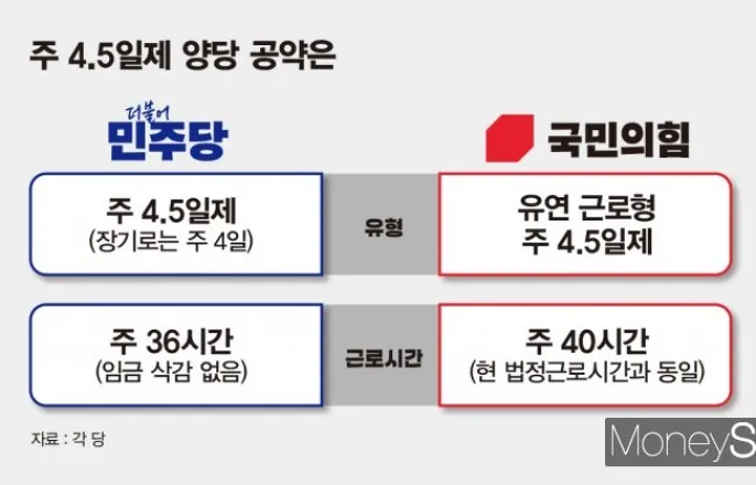 주4.5일제양당공약은같지만방법론엔차이경영계"노사선택권존중해야"이재명더불어민주당후보와김문수국민의힘후보모두주4.5일제를공약으로내걸었지만정책의방향성과접근방식에서는뚜렷한차이를보이고있다.사진은주4.5일제를두고내놓은더불어민주당과국민의힘의공약비교./사진=김은옥기자(머니S)2003년주40시간,주5일근무제를골자로하는근로기준법개정안이국회를통과했을당시만해도"일주일에이틀이나쉰다"는말이낯설게들렸다.그로부터20여년이지난지금대한민국은다시한번노동시간의패러다임전환을눈앞에두고있다.'주4.5일제'가이번대선의뜨거운쟁점으로떠오르면서다.이재명더불어민주당대선후보와김문수국민의힘대선후보모두주4.5일제를공약으로내걸었지만정책의방향성과접근방식에서는뚜렷한차이를보이고있다.━이재명,근로시간감축이핵심…"2030년까지OECD이하로"━이재명후보는법정근로시간단축을통한실질적노동시간감축에초점을맞췄다.사진은이재명더불어민주당대선후보가지난1일서울종로구의한포장마차에서열린배달라이더,택배기사등비(非)전형노동자들과간담회에서노동자들과탄산음료로건배하고있는모습./사진=뉴시스이재명후보는법정근로시간단축을통한실질적노동시간감축에초점을맞췄다.그는"노동이존중받고모든사람의권리가보장되는사회"를만들겠다며주4.5일제도입·확산등으로2030년까지우리나라노동시간을경제협력개발기구(OECD)평균이하로줄이겠다고공약했다.현행근로기준법은주5일근무를별도로규정하지는않고있다.대신1주의근로시간은휴게시간을제외하고40시간을초과할수없으며1일의근로시간은8시간을초과할수없다고명시했다.이후보는범정부차원에서주4.5일제도입을지원하고단계적노동시간단축로드맵을마련하겠다고밝혔다.제도가사회에정착되면법정근로시간을현행주40시간에서36시간으로줄이고궁극적으로는주4일제전환까지추진하겠다는계획이다.그는이를위해"주4.5일제를도입하는기업에전폭적인지원을하겠다"며기업비용부담완화대책을약속했다.━김문수"주4.5일제…총근로시간은유지,유연근무확대가핵심"━반면김문수후보는'기업하기좋은나라'를만들겠다며총근로시간은유지하돼유연근무확대를통한주4.5일제를제시했다.사진은김문수국민의힘대선후보가지난14일경남창원시두산에너빌리티를방문해설명을듣고있는모습./사진=뉴시스김문수후보는'기업하기좋은나라,일하기좋은나라'를만들겠다며총근로시간은유지하되유연근무확대를통한주4.5일제를제시했다.법정근로시간인주40시간은그대로두고업무밀도조절을통해삶의균형을확보하자는방안이다.이를테면월~목요일은하루9시간씩,즉1시간씩더일하고금요일은4시간만근무하는방식으로주4.5일제를설계했다.김후보가발표한10대공약에는주4.5일제관련구체적인계획이담기지않았지만기존국민의힘정책구상에근거해유사한제도를제안할것으로해석된다.다만김후보는4.5일제취지에는공감하면서도"일률적규제는기업자율성을해친다"며노사합의가중요하다는입장을밝혔다.김후보는노사합의를전제로한주52시간제유연화역시함께언급하며기업의자율성과효율성확보를강조했다.━"생산공백과인건비증가우려"vs"임금삭감없는주4.5일제"━정책방향이엇갈리는가운데현장에서도찬반의견이극명하게나뉘고있어사회적합의에는적지않은난관이예상된다.사진은제22대국회에바라는고용노동입법설문조사관련노사관계악영향을줄법안은항목을그래프화시킨이미지./사진=김은옥기자(머니S)정책방향이엇갈리는가운데현장에서는찬반의견이극명하게나뉘고있다.사회적합의에적지않은난관이있을것으로예상되는이유다.경제계는근로일이줄어들경우생산공백과인건비증가를우려하고있다.일반사업장에서는줄어든근무일만큼의공백을메우는게쉽지않아생산성을유지하려면추가인력을채용하거나수당을지급해야한다.지난해한국경영자총협회가200개기업임원을대상으로실시한설문조사에서도응답자의최다비중인34.3%가주4일제·주4.5일제를노사관계에악영향을줄수있는입법으로꼽았다.경총은"대기업을제외하면주4.5일제도입은현실적으로어렵다"며기업의각기다른형편에맞춰자율적으로정할수있게끔노사선택권을확대해야한다고주장한다.중소기업과소상공인의경우인건비부담이급증할수있다는경고도나온다.일부중소기업은"정부정책결정의부담이기업에전가되고있다"고반발하면서대기업은해외생산확대나자동화같은대응이가능하지만중소기업은선택지가없다고호소하고있다.여론은비교적긍정적인반응을보였다.한국리서치가실시한여론조사에따르면주4.5일제도입에찬성하는응답은61%,반대는35%찬성이26%포인트(p)앞섰다.다만국민다수가전제조건으로내건것은'임금보전'이다.같은조사에서63%가"근무시간이줄더라도급여는유지돼야한다"고답했다.이는곧생산성과비용문제를우려하는기업입장과정면으로충돌하는지점이다.이후보는이에대해"임금삭감없이주4.5일제를도입하기위해기업과점진적으로타협하겠다"는입장을밝혔지만구체적인실행방안은아직제시되지않았다.━산업별·직종별격차도과제…"일방적법제화는안돼"━