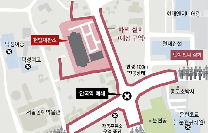 경찰4일갑호비상,헌재난입차단…어제부터200m구간차벽설치안국역폐쇄,광화문역무정차검토탄핵찬반집회분리해충돌예방…궁궐문닫고인근공사장도휴업4일오전11시헌법재판소가윤석열대통령탄핵심판선고를내릴때인근안국역일대와광화문은경찰버스‘차벽’과기동대로촘촘히둘러싸여통제될예정이다.안국역을비롯한인근지하철역도열차가서지않고통과해직장인들은출근길불편을겪을것으로보인다.탄핵찬반시위가곳곳에서격화될가능성이큰가운데경찰은양쪽시위대의충돌을막는데총력을다할계획이다.불상사를대비해의료진과소방인력도곳곳에배치된다.●1일안국역출입구먼저폐쇄…선고일갑호비상경찰은선고사흘전인1일부터24시간상황관리체제에돌입하고사전작업에착수했다.이날오후1시부터안국역2번출구에서재동초등학교까지약200m구간에경찰차벽이설치됐고,차량과보행자의통행도통제됐다.경찰은헌재앞에서천막농성중인시위대에도철수를요청했다.낮12시부터는안국역2∼5번출입구가모두폐쇄됐다.경찰은2일지휘관화상회의를열고경비대책을최종점검할계획이다.선고당일경찰은예고한대로‘갑호비상’을발령하고헌재반경약100m이내를‘진공상태’로만들어철저히출입을통제한다.서울지하철3호선안국역사거리일대는경찰버스차벽이둘러싼다.안국역은모든출입구이용이전면통제되고열차도서지않고그냥통과한다.이때문에이곳에서내렸던직장인들은경복궁역이나종로3가역에서내려걸어와야한다.역장이필요하다고판단하면광화문역,경복궁역,종로3가역,종각역,시청역,한강진역도무정차통과할수있기때문에당일상황에따라출근길혼란이커질가능성도있다.헌재주변학교들은모두임시휴업에들어간다.인근교동초,운현초,중앙중,중앙고등학교와유치원11곳이문을닫는다.용산구한남동대통령관저인근의한남초와병설유치원도휴업한다.헌재주변궁궐과박물관등문화유적시설도하루문을닫는다.경복궁,국립고궁박물관,국립민속박물관,서울공예박물관,창덕궁,덕수궁,대한민국역사박물관모두휴관한다.●기동대1만4000명투입하고차벽,집회대응윤대통령지지자들과탄핵촉구진영사이의격렬한집회가예상되는가운데경찰은이날전국가용경찰력을총동원한다.전체기동대338개부대2만여명중210개부대1만4000여명을서울에집중배치한다.전국가용기동대의60%가서울에투입되는셈이다.서울경찰청기동대는안국역과광화문일대를,그외지방에서상경한기동대는대사관경비등을맡는다.경찰은양측집회참가자들이충돌하지않도록미리구역을나눠놓을방침이다.안국역을기준으로서쪽에는탄핵찬성집회가,동쪽과남쪽에는탄핵반대집회가열릴예정이다.헌재에서다소떨어진광화문역시이날하루종일집회가열릴것으로보인다.광화문광장을기준으로북쪽에는탄핵촉구집회가,남쪽에는탄핵반대집회가열린다.경찰은그사이를차벽으로막을예정이다.●‘헌재난입’가장우려…의료진도곳곳배치경찰은집회격화가불상사나인명피해로이어질가능성을가장경계하며대비할것으로보인다.1월벌어진서울서부지법난입같은상황을막기위해서다.경찰이가장우려하는것은시위대가헌재로난입하는상황이다.선고당일경찰은형사인력을배치하는것은물론경찰기동대도가까운곳에대기시킬예정이다.시위대가헌재에난입하면그자리에서현행범으로체포한다.시위에동원될수있는위험한물품,물건이많은헌재주변주유소,공사장은이날하루문을닫는다.경찰의요청에따른것으로기름이나장비등이시위대에악용될가능성이있기때문이다.위험물을투척할가능성이있는인접건물22곳의옥상출입도제한된다.서울시와종로구는헌재반경1㎞에있는노점상에선고당일휴무해달라고요청했다.또인근상가에는입간판,화분,유리병등을모두치워달라고부탁했다.부상자를대비해안국역,청계광장,한남동,여의대로등4곳에는현장진료소가세워지고의사와간호사가배치된다.서울시는상황실과연결된교통·방범용폐쇄회로(CC)TV를통해집회지점을주시하며대응할방침이다.이상환기자[email protected]서지원기자[email protected]김민지기자[email protected]이지윤기자[email protected]©동아일보.무단전재및재배포금지.