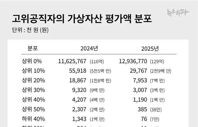 가상자산보유를신고한고위공직자가2024년358명에서2025년에는1,557명으로3.8배급증했다.2025년재산신고대상중약27%가가상자산을보유했다고신고했다.5,682명중1,557명이다.고위공직자들이보유한가상자산평가액도233억원에서465억원으로두배가까이증가했다.가상자산도공직사회에서하나의보편적인재산으로자리잡았음을시사한다.10명중1명은리플,비트코인보유고위공직자들의가상자산보유종목도200여개가늘었다.2024년재산신고내역에는고위공직자338명이445개의가상자산종목을보유했던반면에2025년에는1,274명이694개의종목을보유하고있다.이중에서공직자들이가장많이보유한종목은리플과비트코인이다.▲2025년재산공개대상고위공직자보유가상자산상위10개종목가상자산종목중리플을보유한공직자는2024년129명에서2025년653명으로5배이상증가했다.가장많은리플보유를신고한공직자는서울시의회김혜영의원으로,배우자가51만9천개,장남이3천3백개의리플보유를신고했다.김의원은배우자와장남을포함해총17억상당의가상자산을신고했다.가상자산종목중비트코인을가장많이보유한공직자는청주지방법원의임병렬부장판사로,본인이4.88개,배우자가8.025개를보유해총12.9개의비트코인을보유했다고신고했다.임병렬부장판사는전체공직자중가상자산평가액이두번째로높은공직자다.가상자산보유신고최고액은129억강원특별자치도강릉시의회의김홍수의원이129억3,677만원상당의가상자산보유를신고하며,공직자중가장높은평가액을기록했다.김의원의재산총액은2023년기준6억9,043만원이었으나,2024년부터가상자산이재산신고대상에포함되면서가상자산평가액116억원이추가되어총122억원으로증가했다.2025년에는가상자산평가액129억을포함해총134억원의재산을신고했다.김홍수의원은가상자산보유량에는변동이없으나종목별평가액과환율에따라평가액이달라진것이라고재산변동이유를설명했다.가상자산평가액이두번째로높은공직자는청주지방법원의임병렬부장판사로,총7억1,202만원어치의가상자산을신고했다.이중본인소유가약1억9천만원,배우자소유가약5억2천만원이다.▲고위공직자보유가상자산상위10개가상자산평가액을전체적으로살펴보면,하위20%에해당하는324명의보유액이1,000원미만(0천원)에불과하다.이렇게가상자산평가액이1,000원미만인공직자는2024년30명에서2025년324명으로10배이상증가했다.가상자산을전량매도한공직자도다수있었으나,올해부터가상자산신고가자동화되면서이벤트성으로받은소액의가상자산(에어드롭)까지모두재산신고내역에포함된것으로보인다.2025년재산신고자중에상위30%이내에들려면평가액300만원,상위20%는약800만원,상위10%는약3,000만원상당의가상자산을보유한것으로나타났다.지방·광역의원3명중1명가상자산보유▲지방의회·광역의회·국회가상자산신고자비율2025년재산공개대상자중지방의회와광역의회의원들의가상자산보유비율은각각30.8%,32.4%였다.전체공개대상중가상자산보유신고자는27%,국회소속공직자중가상자산보유신고자는18.5%다.김남국의원의가상자산논란으로2023년5월개정된국회법에따라국회의원은가상자산이이해충돌대상에포함됐으나,광역의원이나지방의원의경우가상자산보유가이해충돌대상이될우려가있음에도불구하고재산공개제도외에이해충돌을방지할만한현행법이마련되지않았다.뉴스타파김지연[email protected]©뉴스타파.무단전재및재배포금지.