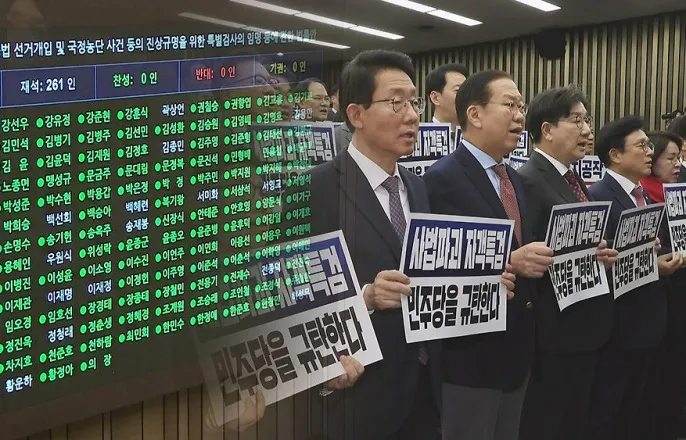 찬성182·반대91·기권1국민의힘'당론반대'속김상욱만찬성표[앵커]이런가운데'명태균특검법'이오늘(27일)민주당등야권주도로국회본회의를통과했습니다.국민의힘은곧바로대통령권한대행에게거부권행사를요청할계획입니다.유한울기자입니다.[기자]'명태균특검법'이재석의원274명중찬성182명,반대91명,기권1명으로국회본회의를통과했습니다.2022년과2024년대통령부부가명태균씨를통해국민의힘공천에개입했다는의혹이나오는선거들을수사대상으로하고있습니다.민주당을비롯해표결에참여한야당의원들은모두찬성표를던졌습니다.[서영교/더불어민주당의원:박근혜대통령이공천에개입했다고탈탈탈털어서3년을구형한그특검이누구입니까.그윤석열이공천에개입했습니다.]국민의힘은"조기대선을겨냥한정략특검"이라며당론으로반대했습니다.[박준태/국민의힘의원:한마디로국민의힘수사특별법입니다.우리당108명의원전체를언제든수사하겠다는의도가담겨있습니다.]'친한계'김상욱의원은여당에서유일하게찬성했습니다.[김상욱/국민의힘의원:대선에당당하게임하게하기위해서라도명태균리스크는우리당이먼저선제적으로정정당당히정리를해야될부분이라고생각을했습니다.]권성동원내대표는최상목대통령권한대행에게거부권행사를요청하겠다고하면서김의원을비판했습니다.[권성동/국민의힘원내대표:당원으로서그리고소속당이있는국회의원으로서잘못된행태다,이렇게비판을합니다.]최권한대행이실제거부권을행사해법안이국회로돌아올경우재표결에서는200명이찬성해야가결됩니다.국민의힘에서8명이이탈해찬성표를던져야하는데,친한계를포함해당내부에서는"쉽지않을것"이라는기류가우세합니다.이러한분위기를전한한친한계의원은다만,"소신에따라투표한김의원을비판한다면그것은김의원이아니라당이이상한것"이라고일침을가했습니다.[영상취재박재현김영묵/영상편집최다희/영상디자인이정회]Copyright©JTBC.무단전재및재배포금지.
