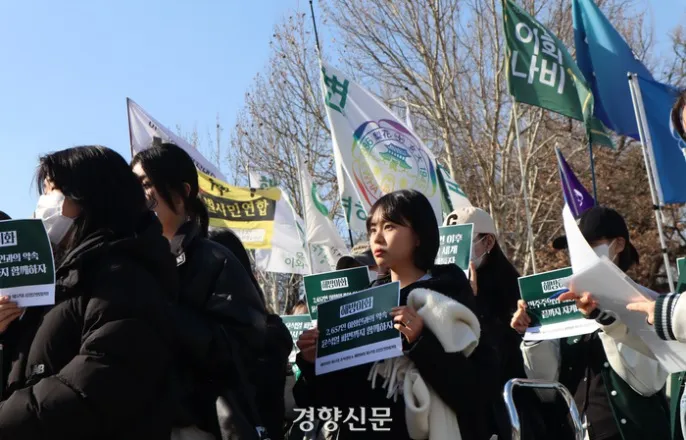 26일서울서대문구이화여자대학교에서열린‘2차시국선언’회견에서한학생이손팻말을들고있다.박정연기자이화여자대학교재학생들과졸업생들이26일윤석열대통령의파면을촉구하는2차시국선언을발표했다.이날도최근다른대학에서처럼탄핵반대를주장하는윤대통령지지자일부가학교에난입해학생들과충돌하며아수라장이벌어졌다.재학생들은“학교어디에도탄핵불복세력이발붙일자리는없다”고반발했다.이화여대총학생회소속학생들과역대총학생회장단인졸업생들은이날오후3시서울서대문구이화여대교정에서‘윤대통령파면촉구2차시국선언’을했다.총학생회장반지민씨는“비민주적이고반헌법적인목소리를막아내고윤대통령의탄핵과사회가치실현을위해함께나가기위해이자리에함께모였다”며“민주주의를흔드는자는탄핵반대를외치는이들”이라고밝혔다.이들은소녀시대의노래<다시만난세계>를함께불렀다.이노래는이화여대학생들이2016년학교의일방적학사개편에반대하는시위중경찰의진압이시작되자이에맞서면서함께부른곡으로,12·3비상계엄에반대하는시민들도지난해부터탄핵촉구집회등에서합창을해온노래다.2016년박근혜전대통령탄핵시국선언당시부총학생회장이었던이해지씨는“10년이라는시간이지난지금,이화여대학생들이이제는최순실·박근혜의꿈이아니라윤석열의꿈이이뤄지는나라냐고묻는지금의현실이맞는거냐”며“몇시간전이화여대에서윤대통령을옹호한내란동조세력에게분노를참을수없다.윤대통령에게남은것은파면밖에없을것”이라고말했다.서울서대문구이화여자대학교에서26일재학생들이윤석열대통령탄핵찬성과반대집회를동시에진행하고있는가운데외부인들이정문에서진행하는반대시위현장까지나와있다.한수빈기자이에앞서오전9시쯤에는‘이화여대긴급행동을준비하는재학생·졸업생’소속학생들이교내대강당앞계단에서집회를열었다.이들은“윤석열파면”“극우세력나가라”라고외치며‘해방이화에서쿠데타옹호웬말이냐’라고적힌손팻말을흔들었다.집회가시작된지30분쯤지나자30여명의외부인들이집회현장에난입해학생들과충돌하는일이벌어졌다.이들은학생들을가로막고탄핵반대시국선언을하기시작했다.최근서울대·연세대·고려대등다른대학에서도벌어졌던윤대통령지지자등의난입이이날은이화여대에서벌어진것이다.윤대통령지지자로추정되는외부인들은집회를하던재학생들과뒤엉켜서로를향해욕설을하고밀치는등몸싸움을벌였다.일부는학생들에게위협을가하기도했다.한노인은검은차량에올라가마이크를들고“평양으로가라XX들아”라고욕설을했다.한극우성향유튜버는“돼지빨갱이X들눈에띄기만해”라고소리를지르기도했다.소동이끝나고오후가되자학교정문은철제펜스로막혀폐쇄됐다.학생들은외부인들이교정에까지난입해탄핵반대집회를하며충돌하는상황에대해우려를표했다.졸업생노현영씨(26)는“신남성연대등외부단체가왜캠퍼스에와서시위를주도하는건지모르겠다”며“외부인출입을철저히단속하는학교라안심하고다녔는데,그런분위기가깨질까걱정”이라고말했다.학생들은“탄핵반대집회에참여하는재학생은소수”라고도했다.재학생이모씨(22)는“이대생은거의보이지도않는데,학생들의공식입장인양탄핵반대를외치는소수학생에대한비판여론이높다”고말했다.재학생박수현씨(21)는“몇달전만해도학내에서열린학생총회에약2600명의학생들이모여대통령탄핵을위한목소리를냈는데,갑작스럽게탄핵반대학생들이나타나서모두황당해하고있다.에브리타임(학내커뮤니티)에는이들을부정적으로보는사람들이압도적으로많다”고말했다.이어“주변학우들은탄핵찬성집회에참여한다.재학생들의집회참여도는꽤높은편”이라고말했다.배시은기자[email protected],박정연기자[email protected],우혜림기자[email protected]©경향신문.무단전재및재배포금지.