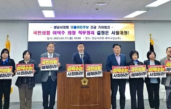 본안사건인'의회의장선임무효확인'판결선고시까지직무정지경기성남시의회더불어민주당협의회가17일오후기자회견을열어법원으로부터직무정지결정을받은이덕수의장(국민의힘)의의원직사퇴를촉구했다.(성남시의회민주당제공.재판매및DB금지)/뉴스1(성남=뉴스1)송용환배수아기자=경기성남시의회더불어민주당협의회가법원으로부터직무정지결정을받은이덕수의장(국민의힘)을향해"의원직을사퇴하라"고촉구했다.민주당협의회는17일오후시의회4층세미나실에서기자회견을열어'이덕수의장직무정지'결정에대해이같은입장을밝혔다.기자회견에앞서수원지법제2행정부(부장판사홍득관)는이날성남시의회민주당의원14명이신청한'의회의장선임의결처분효력정지'신청을인용했다.재판부의인용결정에따라이덕수의장의직무는본안인'의회의장선임결의무효확인'사건의판결이확정될때까지정지된다.민주당은기자회견에서"이번법원의결정은'사필귀정'으로,불법선거로훼손된성남시의회의공정성과투명성을회복하는첫걸음이자민주주의의승리"라는의미를부여했다.이어"이덕수의장은이번사태의책임을지고시민앞에석고대죄는물론의원직도즉각사퇴해야한다"고촉구했다.민주당은국민의힘을향해서도"부정과불법을일삼은국민의힘은해체해야한다"며"앞으로도강력한법적대응은계속될것"이라고강조했다.앞서지난해6월,정용한국민의힘대표의원등소속의원16명은성남시의회후반기의장선거당시기표지를촬영해사회관계망서비스(SNS)단체대화방에인증사진을올리는등비밀투표원칙을어겼다는의혹이제기됐다.이에민주당의원들은국민의힘소속의원16명을위계에의한공무집행방해혐의로경찰에고발했다.수원지검성남지청은정대표의원을불구속기소하고,같은당소속시의원15명(사건이후탈당한무소속1명포함)도같은혐의로벌금형약식기소했다[email protected]©뉴스1.Allrightsreserved.무단전재및재배포,AI학습이용금지.