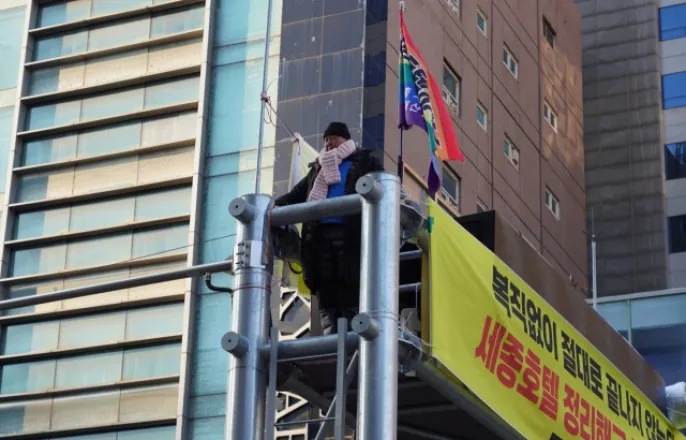 [인터뷰]고진수민주노총관광레저산업노조세종호텔지부장25년차일식요리사인고진수민주노총관광레저산업노조세종호텔지부장.그는2021년12월해고된뒤매일서울명동세종호텔앞인도농성장으로출근했다."복직없이끝나지않는다"라고적힌무지개색현수막이붙은가로10미터,세로3미터너비천막.그곳이지난3년고지부장이가장많은시간을보낸공간이었다.천막을지키기위해차가지나다니는소리와매연,가로등불빛을참고그안에서잠을잔날도많았다.지난13일고지부장은고공에올랐다.세종호텔앞높이10미터,가로10미터,세로1미터너비도로시설구조물위에농성장을차렸다.몸한번편히누이기어려운그곳에서고지부장은안전조끼를입고추락방지용고리를허리높이난간에걸어둔채24시간생활중이다.도로의매연과소음,불빛은전보다도그를괴롭힌다.흔들림과바람도더해졌다.점점위태로운곳으로향하는그가반드시해결하겠다고마음먹은문제는무엇일까.고공농성7일차가되던지난19일고지부장을10미터구조물을사이에두고마주했다.현장에서소통이쉽지않아인터뷰는전화로진행했다.바람소리가쉴새없이들리는전화기너머로고지부장은"개신교대책위분들과아래에있는동지들이하루두번식사를올려주고,간식을많이줘서밥은잘먹고있어요"라고첫마디를뗐다.이어자신이고공에오른이유를말하기시작했다.그의이야기는세종호텔에대한것이었지만,정리해고와노동조합에대한것이기도했다.▲고진수세종호텔지부장이서울명동세종호텔앞도로시설구조물에서고공농성을하고있다.ⓒ프레시안(최용락)정리해고제도로노동자에게전가된코로나위기의피해고지부장이고공에오르게된직접적원인은'정리해고'다.코로나19유행이한창이던2021년8월세종호텔은경영난을이유로구조조정협의체를꾸렸다.이어9월부터11월까지네번에걸쳐희망퇴직공고를내고29명의직원을내보냈다.회사는멈추지않고정리해고를이어가려했다.초유의재난으로회사가힘들다는데,노동자들도막무가내로버티려한것은아니었다.정부가고용유지지원금제도를확대해호텔업종을특별고용지원업종으로지정하고연간최대270일,90%의인건비를지원하던시점이었다.노동자들은이제도를최대한활용해힘든시기를버텨보자고제안했다.회사의반응은차가웠다."코로나유행이언젠가끝날것은분명했어요.그러면억눌려있던관광수요가폭발적으로늘면서호텔사업이회복될것도분명했어요.'고용유지지원금을더신청하면버틸수있다,같이가자'고회사에말했어요.'그래도회사가내야하는돈이있다면,그것도안받겠다'고도했어요.'안된다'더라고요.수천억원에달하는자산을갖고있으면서도,그건고작7억원어치매각해놓고,노동자들에게만이렇게하는건…."네달여뒤구조조정협의체활동이끝났다.2021년12월회사는희망퇴직을거부한15명을정리해고대상자로선정했다.2001년스물아홉의나이로세종호텔에입사해20여년간청춘을바친고지부장도그중한명이었다.한때250여명의정규직이일하던세종호텔에는이제20여명의정규직과40여명의비정규직만남았다.333개객실이있는호텔의야간프런트를지키는근무자는한명이다.2023년5월고지부장의말처럼정부의엔데믹선언으로코로나19사태가끝났다.호텔사업도활기를되찾았다.세종호텔은그해바로10억원대의흑자를기록했다.그러나고지부장과함께해고된뒤복직을요구중인6명은3년째거리를헤매고있다.코로나19로인한위기가남긴고통이IMF위기때도입된정리해고제도를통해노동자에게만전가된셈이다.▲서울명동세종호텔앞에놓인해고자복직욕구농성천막.ⓒ프레시안(최용락)노동조합이무너지자노동조건도무너지기시작했다고지부장이고공에오르게된또다른이유는노동조합이다.다른많은사람처럼그역시젊은시절노동조합에큰관심없이살았다.아침8시에서밤9시까지일하고,대기시간으로설정된2시간에대한임금을받지못하면서도,요리사는원래그렇게일하니당연하다고만생각했다.그런그의생각을바꿔놓은것이세종호텔노조였다."제가입사했던때세종호텔이'유니언숍'으로운영되고있었어요.입사와동시에가입하게돼있었죠.그러면서노동문제에관심을갖게됐어요.11시간넘게일하면서수당을못받는것도,온전히쉬지도못하는대기시간에대한임금을못받는것도잘못됐다는걸알게됐어요.당시에손님들에게서비스요금을받아직원들끼리나눠가졌는데,홀직원은60%를,주방직원은40%를받았어요.이건차별이라는문제의식도갖게됐죠."2005년고지부장은불합리한회사를바꾸는데직접목소리를내보자는생각에노조간부활동을시작했다.마침세종호텔을소유한대양학원의주명건전이사장이세종대에서교비횡령혐의,학내민주화교수해임등문제로직을잃으며호텔에도거대한변화의바람이불던때였다.15년만에노조위원장이바뀌었고,경영진도사외에서새로왔다.전과달리새경영진은교섭자리에서경영자료를투명하게공개했다.그에따라노사교섭도합리적으로이뤄졌다.그때의성과중하나가계약직의정규직전환이다."노조에새집행부가들어서면서노조다운활동을해보자는분위기가일었어요.교육도열심히받으러다녔죠.그러다내부의계약직을정규직으로전환하자고다같이마음먹었어요.이전까지정규직전환은경영진마음대