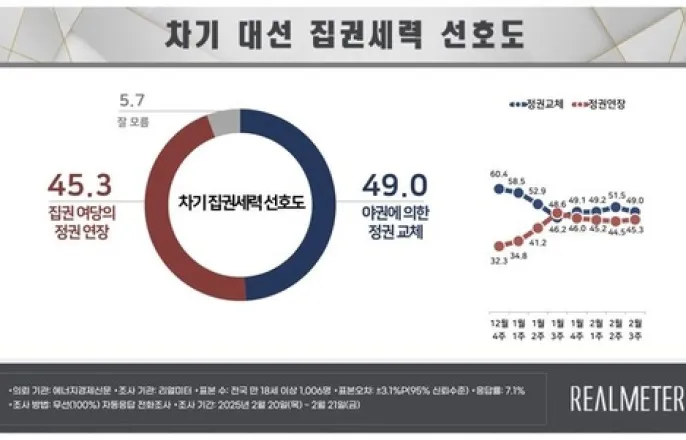 정권연장0.8%↑,교체2.5%p↓…중도층서연장38.3%·교체56.5%국민의힘·민주당,4주째오차범위내접전…중도층서국민의힘35.3%·민주45.6%차기대선집권세력선호도[리얼미터제공.재판매및DB금지](서울=연합뉴스)최평천기자='정권연장론'과'정권교체론'이오차범위내격차라는여론조사결과가24일나왔다.리얼미터가에너지경제신문의뢰로지난20∼21일전국만18세이상유권자1천6명을대상으로차기대선집권세력선호도를조사(95%신뢰수준에±3.1%포인트)한결과,'집권여당의정권연장'의견은45.3%,'야권에의한정권교체'의견은49.0%로집계됐다.'잘모르겠다'는응답은5.7%였다.일주일전조사와비교해정권연장론은0.8%포인트(p)상승했고,정권교체론은2.5%p하락했다.지난주7%p였던두의견간차이는3.7%p로1주일만에오차범위내로좁혀졌다.권역별로는충청권(정권연장57.1%·정권교체40.4%)과대구·경북(54.3%·38.8%)에서정권연장론이강했지만,호남권(30.5%·66.2%)과인천/경기(41.8%·51.8%)에서는정권교체론이우세했다.부산·경남(47.4%·46.8%)과서울(45.1%·49.4%)에서는두의견차이가크지않았다.연령대별로보면70세이상(정권연장62.9%·정권교체29.3%),60대(51.1%·44.3%),20대(50.2%·39.8%)에서정권연장의견이많았고,40대(29.2%·68.0%),50대(36.5%·58.3%)에서는정권교체의견이많았다.국민의힘지지층에서는91.2%가정권연장론을,민주당지지층에서는94.9%가정권교체론을지지했다.무당층에서는정권연장(37.2%)과정권교체(38.7%)의견이비슷했다.이념성향별로보면보수층에서는72.6%가정권연장을,진보층에서는80.8%가정권교체를기대했다.중도층에서는정권교체(56.5%)가정권연장(38.3%)의견보다많았다.리얼미터는"70세이상과20대,충청권,진보층내에서정권교체의견이주로이탈해정권연장의견으로이동했다"고분석했다.정당지지도[리얼미터제공.재판매및DB금지]정당지지도조사에서는국민의힘이42.7%,더불어민주당이41.1%로조사됐다.국민의힘지지도는일주일전조사와비교해1.3%p올랐고,민주당은2.0%p내렸다.리얼미터는"양당간격차는1.6%p로4주째오차범위내팽팽한접전을이어가고있다"며"충청권,70세이상과20대에서국민의힘은결집하고민주당은이탈폭이컸다"고설명했다.국민의힘지지도는대전·세종·충청(13.9%p↑),대구·경북(2.3%p↑),남성(2.4%p↑),20대(11.3%p↑),70대이상(6.2%p↑),진보층(4.6%p↑),중도층(2.5%p↑)에서상승했고부산·울산·경남(2.4%p↓),50대(2.8%p↓),60대(2.3%p↓),보수층(3.0%p↓)에서하락했다.민주당지지도는대구·경북(7.6%p↑),부산·울산·경남(5.8%p↑),30대(2.4%p↑),40대(2.1%p↑),보수층(2.2%p↑)에서올랐고대전·세종·충청(12.4%p↓),인천·경기(4.6%p↓),여성(3.0%p↓),20대(9.9%p↓),70대이상(6.7%p↓),진보층(2.9%p↓),중도층(2.2%p↓)에서내렸다.자신의이념성향을중도층이라답한응답자의45.6%는민주당을,35.3%는국민의힘을지지했다.이밖에조국혁신당은4.4%,개혁신당은1.4%,진보당은0.7%로나타났다.지지정당이없는무당층은7.8%였다.이번조사는무선(100%)자동응답방식으로진행됐고,응답률은7.1%였다.자세한내용은중앙선거여론조사심의위원회홈페이지참조[email protected]▶제보는카톡okjeboCopyright©연합뉴스.무단전재-재배포,AI학습및활용금지