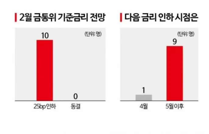 아시아경제국내전문가10인설문조사정치리스크·환율변동성상대적안정속실물경기둔화·저성장우려↑…2월인하무게다음인하'5월이후'…올해3회또는2회인하트럼프정책주목…환율변동성·내수부진핵심변수한국은행금융통화위원회가오는25일기준금리결정을앞둔상황에서전문가들은0.25%포인트(25bp)인하에무게를실었다.예상대로이달25bp인하가이뤄지면기준금리는연3.00%에서2.75%로조정된다.2년4개월여만에다시2%대로내려오는것이다.전문가들은경기하방압력우려가짙어진상황에서국내정치리스크와환율변동성이상대적으로안정세를보이고있다며'2월인하'에힘을실었다.다음인하는5월이후,올해인하횟수는3회가될것이라는예상이우세했다.다만미국정책금리인하지연에힘이실리면서한국역시2회인하에그칠것이란전망역시전달보다비중을높였다.10명모두"2월25bp인하"…'다음인하5월이후'무게24일아시아경제가국내외경제연구소·증권사·은행등의경제전문가10명을대상으로지난17일부터21일까지설문조사를진행한결과,응답자전원이이달기준금리25bp인하를예상했다.전문가들은지난달금통위원모두가경기하방리스크우려를표했음에도금리가동결된주요요인인'정치변수'와'환율부담'이상대적안정권에접어들었다고분석했다.지난해말극심한정국혼란과강달러압력속에원·달러환율은1480원까지상승하는등변동폭을키운바있다.급등락은지난달까지이어지다가미국트럼프2기행정부관세우려완화등에현재1430~1440원대에서움직이고있다.안재균신한투자증권연구원은"추가정치불확실성확대가제한된가운데강달러압력진정으로원·달러환율상승이소강상태"라며"저성장우려가짙어진상황에초점을맞추며금리인하에나설것"이라고말했다.김성수한화투자증권연구원역시"'환율만'아니었으면1월에내렸다는것이금통위원들의공통된의견이었다"며"환변동성이잦아든만큼2월인하가유력하다"고했다.물가역시안정세에접어든상황에서내수둔화와수출증가율하락등에따른저성장우려에주목할것이란분석이다.강승원NH투자증권연구원은"유가만안정된다면한국은물가문제도부담이없는상황"이라며"지난해말부터최근까지한국경제성장률전망치하향조정이큰폭이뤄진데방점이찍힐것"이라고말했다.금통위원만장일치인하가능성역시높다고봤다.공동락대신증권연구원은"높아진경기하방위험,정치적불확실성요인에따른정책부재리스크등을고려해인하결정은만장일치로이뤄질것으로예상한다"고말했다.올해는…경기부진대응'3회인하'vs미국인하지연'2회인하'다음인하시점은90%(9명)가'5월이후'로전망했다.2월금리인하후물가추이와추가경정예산(추경)결정등을지켜볼필요가있다는것이다.강민주ING은행수석이코노미스트는"지난해말이후총3회에걸친금리인하효과를모니터링하는한편물가상승률둔화여부도주의깊게살펴볼것"이라고전망했다.안재균연구원역시"추가인하가능성을열어두겠으나,추경시행시점에맞춰경기부양효과극대화에주력할것"이라고설명했다.다만2월이후금리결정이이뤄지는4월에연이어25bp추가인하가이뤄질것이라는의견도있었다.조영무LG경영연구원연구위원은"경기부진이확인된데따른통화완화정책대응필요성이고조돼4월추가인하를예상한다"고진단했다.연합뉴스올해금통위금리인하는총3번있을것이란의견이50%(5명)로가장많았다.올해최종금리는2.25%가될것이라는전망이다.김성수연구원은"지난해말부터한은은경기부진에사전대응할것임을시사했다"며"물가재상승우려도크지않고,'인하사이클은인상시기대비국내에집중할수있는여력이더크다'는이창용총재발언을고려할때,적극적인정책대응가능성이높을것"이라고짚었다.박상현iM증권연구원역시"연말까지금리2.25%를전망한다"며"물가안정기조하에서대외불확실성리스크확대에따른경기추가하방리스크를상쇄시키기위해공격적통화정책이필요한상황"이라고봤다.다만올해2번인하에그칠것이란전망역시30%(3명)에달하면서비중이종전보다늘었다.미국연방준비제도(Fed)금리인상지연등으로인하부담이커진상황에서재정확대와조합을이루는통화완화는일단기준금리를중립수준까지조정한후상황에맞추는전략을택할것이란분석이다.공동락연구원은"추가인하시환율변동성위험에노출될여지등도반영해올해금리2회인하를예상한다"고말했다.美3월동결…상반기1회·올해2회인하전망미국정책금리의경우다음(3월)연방공개시장위원회(FOMC)에선대부분동결할것으로봤다.물가상승세가좀처럼둔화하지않고있고고용시장또한양호한수준을보이고있어서다.당분간은금리동결통해물가및고용상황점검에나설것이라는예상이다.다만올상반기중에는1차례인하할것이란의견이90%(9명)에달했다.민간소비지표가두달연속시장예상치를하회하는수준으로발표된다면하반기금리인하에대한기대감도다시살아날것이라는전망이다.추가인하시점은6월이될것이란의견이지배적이었다.강승원연구원은"미국신정부경제정책방향의핵심은정부지출을축소하겠다는것"이라며"신정부정책운용방식이반영된경제지표가2분기에는확인될것"이라고말했다.6월에는경기과열과물가에대한우려가완화되며Fed의인하가재개될수있을