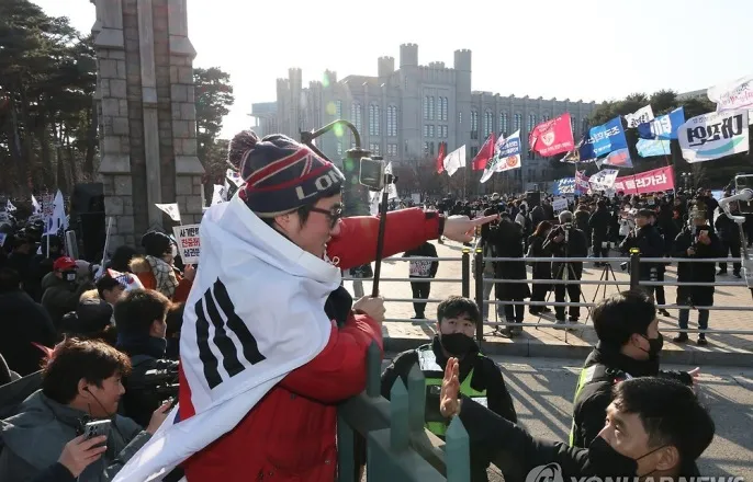 재학생찬반집회소식에집결…곳곳욕설·몸싸움에경찰배치교문사이에두고열린찬반집회(서울=연합뉴스)이진욱기자=21일서울성북구고려대교문을사이에두고윤석열대통령탄핵에대한찬반집회가열린가운데보수단체회원이대치중정문을넘어가려다제지당하고있다[email protected](서울=연합뉴스)이동환정윤주이율립기자=윤석열대통령탄핵여부를두고학생들의찬반집회가예고된고려대캠퍼스에유튜버와외부단체가몰려와큰혼란이빚어졌다.탄핵찬성집회와반대시국선언이21일오후고려대에서열린다는소식에찬반단체,유튜버,윤대통령지지자들이교내중앙광장에모여들어뒤엉켰다.이들대부분은재학생이아니었다.중·장년층으로보이는사람도많았다.이들은"내란옹호극우세력물러가라","내란세력이재명을구속하라"등구호를주고받았다.서로를향해욕설하며곳곳에서몸싸움도일어났다.캠퍼스안으로태극기를든윤대통령지지자들과극우유튜버들이진입했고,탄핵에찬성하는조국혁신당,한국대학생진보연합(대진연)등깃발도곳곳에서등장했다.결국경찰기동대와고려대직원들이나서정문을닫고양측을떼어놨다.유튜버들은"빨갱이XX들","니들이우파XX들이냐"고외치며말싸움을이어갔다.고려대정문앞에서는경찰기동대가방패를들고질서관리에나섰다.대학정문앞에경찰이동원된이례적광경에지나가는시민들도발걸음을멈춰섰다.고려대앞경찰기동대[촬영정윤주]정문바깥에는탄핵반대측이모였다.오후5시기준경찰비공식추산340명으로이가운데재학생은20명정도였고윤대통령지지자와유튜버가320명이었다.정문안중앙광장에모인탄핵찬성측(경찰비공식추산165명)도재학생은20명쯤됐고탄핵지지자130명,유튜버15명이었다.탄핵찬성유튜버들이보수유튜버들의캠퍼스진입시도를막던과정에서2명이부상을호소해병원으로이송됐다.보수유튜버들은"빨갱이쇼하지말라"며앰뷸런스에실려가는유튜버에게욕설했다.일부보수유튜버는바닥에드러누워자기모습을생중계했다.양측은정문을사이에두고대치를이어가다오후6시께대부분해산했다.고려대중앙광장에모인탄핵찬성단체[촬영이율립]민주광장에서열린탄핵찬성집회에서대학원생오수진씨는"비상계엄옹호세력이감히민주화성지인고려대캠퍼스에서활개치는것을볼수없다"고말했다.집회에는민주화운동에참여한졸업생모임인고려대민주동우회등100여명이모여"민주광장을지켜내자","열사정신을계승하자"등구호를외쳤다.정문앞에선탄핵에반대하는재학생김미강씨가"자유민주주의를지키고선배들이피와땀으로세운대한민국기치를지키자"고말했다.주변에모인학생과윤대통령지지자들은"부정선거고대는밝혀낸다","공산당을몰아내자"등을외쳤다.'국민변호인단'어깨띠를두른지지자도있었다.교문사이에두고열린찬반집회(서울=연합뉴스)이진욱기자=21일서울고려대에서'윤석열퇴진긴급고려대행동을준비하는모임'소속학생및동문들이교문밖에서집회중인'대통령탄핵을반대하는고대인들'소속회원들과교문을사이에두고집회하고있다[email protected]대학생익명커뮤니티'에브리타임'에는"학교에서하는시위면외부인이아니라자교학생들이중심이돼야하는게맞지않느냐","거의다외부인인것같은데왜남의학교와서난리냐","외부인이라도막아달라"등의글이올라왔다[email protected]▶제보는카톡okjeboCopyright©연합뉴스.무단전재-재배포,AI학습및활용금지