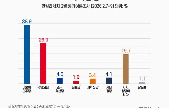 양당지지율격차12%p…지난달比3.2%p좁혀져지방선거후보선호도,민주44.2%·국힘31.7%與지선후보,50대가장선호…국힘선호女층소폭높아그래픽=윤기만디자이너더불어민주당지지율이38.9%로집계되며국민의힘지지율(26.9%)과격차가소폭좁혀졌다는여론조사결과가나왔다.쿠키뉴스의뢰로여론조사전문기관한길리서치가지난7일부터9일까지전국에거주하는만18세이상남녀1015명을대상으로조사한결과민주당지지율은38.9%로집계됐다.같은기관의지난달조사(40.2%)대비1.3%포인트(p)떨어진수치다.다만민주당지지율은지난해11월조사부터38~40%대박스권을유지하고있다.국민의힘지지율은26.9%로지난달조사(25.0%)대비1.9%증가해같은기관은최근9개월내조사중가장높은수치를기록했다.다만아직까지25%전후의박스권을지속하는모양새다.양당의격차는12%p로지난달격차(15.2%p)와지난해12월격차(15.6%p)와비교해좁혀진것으로나타났다.조국혁신당지지율은4.0%,이어개혁신당3.4%,진보당1.9%로집계됐다.기타정당은4.1%,무당층은19.7%로집계됐다.무당층비율은지난해10월25.7%를기록한이후지속적으로낮아졌다.연령별로보면민주당지지율은50대가50.0%로가장높았다.이어40대(42.2%),30대·60대·70대이상이각각35%대수준을보였다.18~29세는31.5%였다.국민의힘지지율은70대이상(36.5%)이1위를차지했다.뒤이어60대(34.4%),18~29세(33.5%),30대(23.2%),50대(21.1%),40대(14.7%)로나타났다.무당층비율은30대·40대가각각26.1%·26.0%로타연령대보다높았다.이어18~29세(20.1%),50대(18.1%),70대이상(14.5%),60대(13.9%)순이었다.성별로는거대양당모두여성층지지율이높았지만,오차범위내로조사됐다.민주당지지율은여자39.6%,남자38.1%다.국민의힘지지율은여자27.8%,남자26.1%로나타났다.무당층은남자가20.9%로여자(18.5%)보다소폭높았다.그래픽=윤기만디자이너같은조사에서오는6월3일예정된제9회전국동시지방선거정당별후보자선호도는민주당이국민의힘보다12.5%p앞섰다.민주당후보선호도는44.2%로집계됐다.국민의힘후보선호도는31.7%다.이어‘지지후보없음’(11.0%),기타정당후보(4.8%),무소속(3.8%)등이었다.의견을유보한응답자는4.6%였다.성별선호도를보면민주당은남자비율이44.8%로여자(43.5%)보다1.3%p높았다.반면국민의힘후보선호도는여자가33.6%로,남자(29.7%)보다3.9%p높았다.연령별로볼때민주당후보선호도는50대가가장높았다.50대의민주당후보선호도는55.5%로집계됐다.이어40대(44.9%),30대(42.0%),70대이상(41.1%),60대(40.9%),18~29세(37.7%)로조사됐다.국민의힘후보선호도는18~29세가41.8%로가장높았다.이어70대이상(40.1%),60대(34.7%),30대(30.0%),40대(25.3%),50대(21.3%)로확인됐다.‘지지후보가없다’고답한응답자는30대(17.3%),40대(14.1%),50대(11.7%)순이었다.이외연령대는모두7.5%~7.6%수준으로나타났다.지역별로는호남권의민주당후보선호도가72.0%로1위였다.부산·울산·경남(부울경,PK)은2위(47.0%)를차지했다.이어인천·경기(46.0%),서울(41.2%),충청권(40.7%),강원·제주(33.2%),대구·경북(TK)20.4%순이다.반면국민의힘후보선호도는TK가51.5%로1위였다.이어충청권(37.0%),서울(33.2%),PK(32.8%),인천·경기(29.3%),강원·제주(27.4%),호남권(10.8%)등이다.이번설문조사는유선전화면접3.8%·무선ARS96.2%로병행해진행됐다.응답률은2.1%,표본오차는95%신뢰수준에오차범위±3.1%p다.표본추출은유무선전화RDD표본프레임에서무작위추출했다.자세한조사개요와결과는한길리서치와중앙선거여론조사심의위원회홈페이지를참조하면된다.김건주기자[email protected]©쿠키뉴스.무단전재및재배포금지.