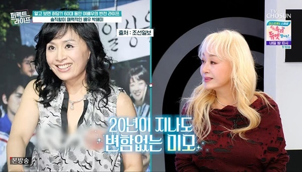 TV조선‘퍼펙트라이프’캡처TV조선‘퍼펙트라이프’캡처[뉴스엔유경상기자]박해미가20년전과똑같은미모로건강을드러냈다.4월22일방송된TV조선‘퍼펙트라이프’에서는배우박해미(63세)가출연했다.현영은금발로출연한박해미에게“샤론스톤같다.더예뻐지셨다”고칭찬했고,박해미는“그대도요”라고화답했다.이어현영은시트콤‘거침없이하이킥’이2006년작품으로벌써20년전이라고시간의흐름에놀랐다.현영이박해미는똑같은모습으로앉아있다며감탄하자박해미는“그런것같냐.고맙다.20살이나더먹은게믿어지지않는다.숫자는개념이없다”고숫자에개의치않는다고말했다.이어박해미는건강문제에대해“잠도잘자고아픈곳도없다.여러가지로건강하긴하다”고말했다.이성미는“저랑5살차이밖에안난다.나는온몸이비상사태다.이렇게건강한걸보면갱년기는어땠냐.안힘들었냐”고질문했다.박해미는“갱년기를모르고지나갔다.나만혼자더워서부채질을했다.남들은아무렇지않고.못느끼고지나갔다”고답했다.뉴스엔유경상yooks@기사제보및보도자료[email protected]ⓒ뉴스엔.무단전재&재배포금지Copyright©뉴스엔.무단전재및재배포금지.