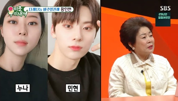 SBS‘미운우리새끼’SBS‘미운우리새끼’[뉴스엔유경상기자]황민현이붕어빵친누나를공개하며매형이동갑이라어색했다고말했다.2월1일방송된SBS‘미운우리새끼’에서는가수겸배우황민현이제대한달만에첫예능에출연했다.황민현은1살많은친누나가결혼을했다며결혼식에서직접축가를불렀다고말했다.어릴때많이싸운누나가결혼을해서마음이싱숭생숭하기도했다고.신동엽은“매형처음봤을때느낌이어땠냐”고질문했고,황민현은“형들에게편하게잘다가가는편인데매형이저랑동갑이다.처음에는매형이라고해야할지이름을불러야할지너무불편하기도한데매형도제가연예인이니까어려워하더라”고답했다.신동엽이“매형이라고편하게하면된다”고말하자황민현은“매형이라고하고존댓말은안해도된다고하더라”고반응했다.서장훈은“올해팬미팅으로팬들을찾아갈예정이라고?”라고질문했고황민현은“그동안팬들에게고마운마음을전하려고2월서울,3월도쿄에서팬미팅을하게됐다”고팬들과만날계획을전했다.(사진=SBS‘미운우리새끼’캡처)뉴스엔유경상yooks@기사제보및보도자료[email protected]ⓒ뉴스엔.무단전재&재배포금지Copyright©뉴스엔.무단전재및재배포금지.
