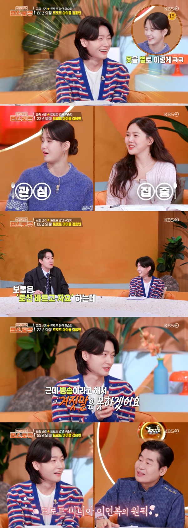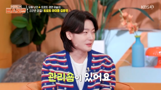[스타뉴스|김정주기자]/사진=KBS2TV예능프로그램'신상출시편스토랑'가수김용빈이피부관리비결을공개했다.20일방송된KBS2TV예능프로그램'신상출시편스토랑'에는트로트계아이돌김용빈이스페셜MC로출연했다.이날효정은"옆에반짝반짝하시는분이계신다.어머님분들이이분때문에난리가났다.2025년트로트경연프로그램에서국민투표8주연속1위라는신기록을달성했고역대급우승을한분이다"라며김용빈을'트로트계과즙상아이돌'이라고소개했다.효정은"피부가무슨일이냐"라고놀라워했고,붐역시"어제뭐하고잤냐.솔직히정보좀달라"라고궁금증을드러냈다./사진=KBS2TV예능프로그램'신상출시편스토랑'이에김용빈은"제가가는관리숍이있다.쉬는날만되면관리한다"라고털어놔웃음을안겼다.이를듣던붐은"이렇게솔직하다.보통'로션바르고잔다'라고말하는데'관리숍있어서매일가요.쉴때마다가요'라고한다"라고너스레를떨었다.김용빈은"방송이라고해서거짓말은못하겠더라"라고고백해웃음을안겼다.김정주기자[email protected]©스타뉴스&starnewskorea.com,무단전재및재배포금지