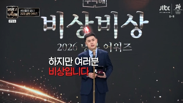 JTBC‘냉장고를부탁해since2014’캡처JTBC‘냉장고를부탁해since2014’캡처[뉴스엔서유나기자]셰프권성준이비상사태를선포했다.2월1일방송된JTBC예능'냉장고를부탁해since2014'(이하'냉부')58회에서는셰프들의파티'2026냉부어워즈'가열렸다.이날특별상'비상비상'을수상한권성준은"일단제가1년동안살아남기위해정말많은캐릭터들을연구하고만들었다"고입을열었다.권성준은"하지만여러분비상"이라며"시기적으로'흑백요리사2'가나오며많은분들이저희의자리를노리고있다.비상비상,각자의자리는자기가열심히노력해서지키도록하자"고말했다.이런권성준에겐경광등이상품으로증정됐다.뉴스엔서유나stranger77@기사제보및보도자료[email protected]ⓒ뉴스엔.무단전재&재배포금지Copyright©뉴스엔.무단전재및재배포금지.