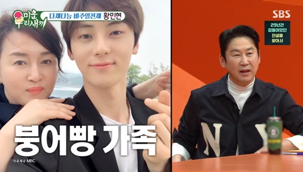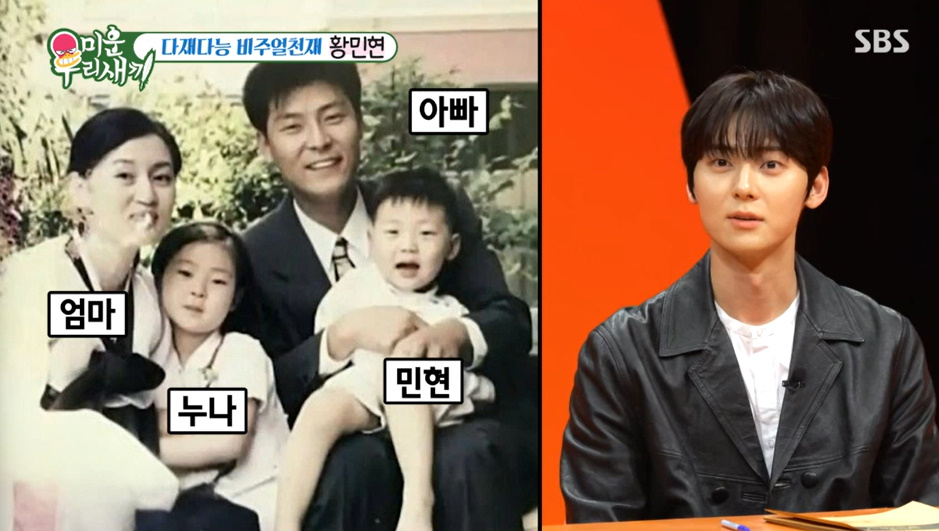 SBS‘미운우리새끼’SBS‘미운우리새끼’[뉴스엔유경상기자]황민현이똑닮은붕어빵가족을공개했다.2월1일방송된SBS‘미운우리새끼’에서는가수겸배우황민현이제대한달만에첫예능에출연했다.신동엽은“황민현이잘생길수밖에없는이유가있다.가족들과똑닮아서화제가됐다”고말했고,황민현이가족사진을공개하자모벤져스가“좋은것만다닮았다”며감탄했다.서장훈은“엄마많이닮았다.누나도많이닮았네”라고반응했고,황민현은“다행히엄마피부가하얀데그걸닮았다.아빠는피부가어두운데키가크다.좋은부분만닮았다”고말했다.이어황민현은1살많은친누나결혼식에서직접축가를불렀다며“어릴때많이싸웠다.결혼한다고하니까마음이싱숭생숭하고해줄수있는게뭐가있을까.그래도가수니까축가를불러줬다”고말했다.(사진=SBS‘미운우리새끼’캡처)뉴스엔유경상yooks@기사제보및보도자료[email protected]ⓒ뉴스엔.무단전재&재배포금지Copyright©뉴스엔.무단전재및재배포금지.