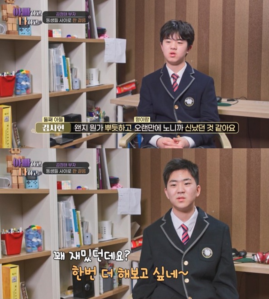 ▲아빠하고나하고.제공ㅣTV조선[스포티비뉴스=강효진기자]TV조선'아빠하고나하고3'에서아스퍼거증후군진단을받은김정태장남지후가동생의친구들에게먼저다가가소통하는모습으로김정태부부를놀라게했다.22일방송된TV조선'아빠하고나하고3'은부모님몰래한일탈고백릴레이로시작됐다.현주엽은"대학교때운동이일찍끝나면선배형들과나이트클럽에갔다.어머니가직접잡으러오셨다"고말했다.한혜진은"2000년대피어싱이유행해엄마몰래배꼽을뚫었는데염증이너무많이생겨서다시막았다"고고백했다.전현무도"고3때엄마가싸주신호두과자를수업중몰래먹으려다선생님께걸려서하키스틱으로맞았다"고밝혀웃음을자아냈다.이어김정태가족의일상이공개됐다.학교가끝나자혼자있기를좋아하는김정태의장남지후는홀로조용히하교했다.동생시현은친구들과함께시끌벅적하게하교해극과극의모습을보여줬다.방과후시현은절친3인방을초대했고,아빠김정태도자연스럽게아이들과대화를이어갔다.지후는방에서강의를듣고공부에몰두하며혼자만의시간을보냈다.저녁시간이되자김정태아내는지후에게동생들의라면을부탁했다.지후는"라면6개는처음인데"라면서도동생들을위해도전했다.거실에서김정태와시현,친구들이밸런스보드를가지고놀자지후는"나도이거해볼까?"라며먼저다가갔다.시현은"형이친구들과어울려노는걸몇개월만에봐서놀랐다.신났다"라며반겼다.이들은지후표라면과엄마표부산어묵을함께먹으며즐거운시간을보냈다.지후의변화에김정태는"고무적인일이다"라며뿌듯해했다.전현무와한혜진도소통을시작한지후의변화에놀라움을표했다.▲아빠하고나하고.제공ㅣTV조선시현은친구들에게샤워독립문제를꺼냈다.김정태는여러핑계를대며약속을미뤄왔으나,친구들이이미샤워독립을마쳤다는사실에결국22일부터혼자씻는다고모두의앞에서재선언했다.김정태는시현이친구들에게건의사항을조사했다.지후는"너희는아빠랑취향이비슷해?"라며먼저질문을던졌다.스스로대화를이끄는지후의모습에김정태부부는깜짝놀랐다.지후는자신의관심사인미술을꺼냈다가반응이없자자연스럽게화제를돌렸다.지후는"조금친해지고싶어서질문해봤다"고밝혔다.아내는"지후가변했다.사회성이진짜많이늘었다"라며감동했다.김정태는방송이후지후의유튜브채널구독자가3배로증가하는등긍정적변화가이어지고있다는희소식을전했다.전수경의제안으로시작된97세전수경아버지의전국구가요제도전기도공개됐다.전수경아버지는"경쟁자는많을수록기분좋다"라며쿨하게도전을선언했다.가요제접수처직원은"90세이상어르신은처음이다"라며경로우대할인을약속했다.전수경은일일선생님으로'미스트롯3'미출신오유진을초대했다.17세오유진은학생이80살연상이라는사실에깜짝놀랐다.전수경아버지는남진의'둥지'로실력테스트에나섰으나긴장한듯박자와가사실수를저질렀다.오유진은냉철한지적과함께오디션꿀팁을전하며카리스마를선보였다.전수경아버지가애창곡'추억의소야곡'을열창하자오유진과전현무는감탄했다.오유진은손하트,깨물하트등무대매너를전수했고,전수경아버지는"스승을얻어영광이다"라며고마운마음을표현했다.TV조선'아빠하고나하고3'은매주오후10시에방송된다.<저작권자ⓒSPOTVNEWS.무단전재및재배포금지>Copyright©스포티비뉴스.무단전재및재배포금지.