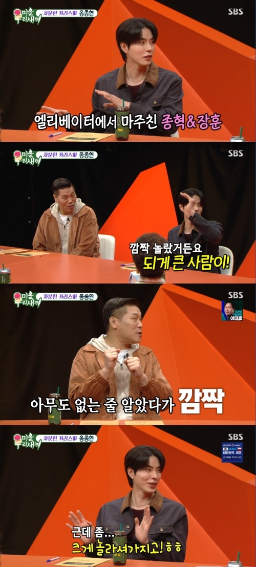 ‘미운우리새끼’사진|SBS홍종현이서장훈과구면이라고말했다.22일오후방송된SBS예능프로그램‘미운우리새끼’(이하‘미우새’)에는배우홍종현이게스트로출연해화려한입담을펼쳤다.이날방송에서홍종현은신동엽과친분이있다면서서장훈과도두세번봤다고했다.서장훈이언제봤냐고묻자홍종현은“예전에같은아파트에살았다.엘리베이터에서마주쳤다.되게큰사람이있어서놀랐다.저보다더놀라시더라”고했다.서장훈은“아무도없다고생각했는데문이열리고앞에누가있어서놀란거다.다른것때문에놀란게아니다”라고해명했다.홍종현은“근데좀매우놀라셨다.놀라셔서사과도하셨다”며과거를회상했다.이를듣던신동엽은“종현이가따뜻하게잘풀어간다.옆에어떤여성이있었는지는일절말안하고놀란얘기만한다”고너스레를떨어웃음을자아냈다.‘미운우리새끼’는일요일오후9시5분SBS에서방송된다.[서예지스타투데이객원기자]Copyright©스타투데이.무단전재,재배포및AI학습이용금지