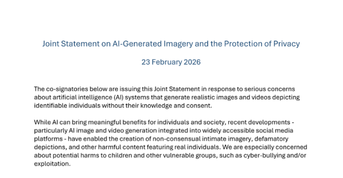 인공지능생성콘텐츠와개인정보보호에관한공동선언문일부(사진:개인정보위원회)국제개인정보감독기구들이생성형인공지능(AI)기반콘텐츠오남용에공동대응하기로했다.개인정보보호위원회는23일국제개인정보감독기구협의체(GPA)차원의'인공지능생성콘텐츠와개인정보보호에관한공동선언문'채택에참여했다고밝혔다.최근'그록(Grok)'등생성형AI서비스를악용한딥페이크와미성년자성적이미지생성·확산이세계적문제로부상했다.실제인물이동의없이합성이미지로제작·유포되는사례가늘면서프라이버시침해우려가커진것이다.이번선언은국제사회가AI생성콘텐츠로인한개인정보침해에대해일관된원칙을공식화했다는점에서의미가있다.한국을포함해프랑스,영국,싱가포르,캐나다,유럽연합(EU)등52개국61개개인정보감독기구가서명에참여했다.선언문은우선AI개발·운영단계에서개인정보오남용과동의없는성적콘텐츠생성이구조적으로차단되도록안전조치를갖출것을요구했다.사후대응이아니라설계단계부터위험을줄이라는취지다.아울러이용자가AI시스템의기능과한계를명확히알수있도록투명성을확보해야한다고밝혔다.서비스의적용범위와사용조건을숨기지말고공개하라는의미다.피해가발생했을경우에는신속한신고와삭제가가능하도록실효성있는구제절차를마련해야한다는점도강조했다.형식적창구가아닌,실제로작동하는권리구제체계를갖추라는요구다.특히아동·청소년에대해서는연령에적합한정보제공과추가보호조치를이행해야한다고명시했다.미성년자는생성형AI환경에서더큰위험에노출될수있다는판단이반영됐다.각국감독기구는'신뢰할수있는인공지능혁신'이라는공동가치를실현하기위해정책.집행,교육경험을공유하고연대를강화하기로했다.송경희개인정보위위원장은“딥페이크등인공지능콘텐츠생성기술의오남용으로인한개인정보침해위험에국제사회와공동으로대응하겠다”고말했다.박진형기자[email protected]©전자신문.무단전재및재배포금지.