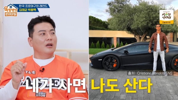 사진=KBS2옥탑방의문제아들캡처[스포츠투데이송오정기자]야구선수출신김태균이자동차를수집하는취미를가졌을당시,8억원짜리슈퍼카를구매했던이유를밝혔다.혼자만의경쟁때문이었다.23일방송된KBS2'옥탑방의문제아들'(이하'옥문아')에한국야구레전드김태균,박용택이출연했다.KBO역사상최초10억대연봉을달성했던김태균.그당시김태균의취미가자동차수집이었다고.사진=KBS2옥탑방의문제아들캡처김태균은민망한듯웃으며"선수들이풀게없다.매일경기하고시간이없으니까.그래서저에게선물을주는게자동차였던것"이라고설명했다.최대6대까지보유했다는김태균은"호날두선수랑혼자경쟁이붙어서.그당시호날두선수가슈퍼카사진을올리고그랬다.그러면'한국1호차는내가해야지'란생각으로똑같은걸주문했다"라고밝혔다.무광블랙슈퍼카의가격은무려8억이었다.홍진경은경악하며"연봉이10억인데차를8억짜리를사?!"라고타박해웃음을자아냈다.김태균은"그러니까지금은너무후회하고있다"라고덧붙였다.[스포츠투데이송오정기자[email protected]]Copyright©스포츠투데이.무단전재및재배포금지.