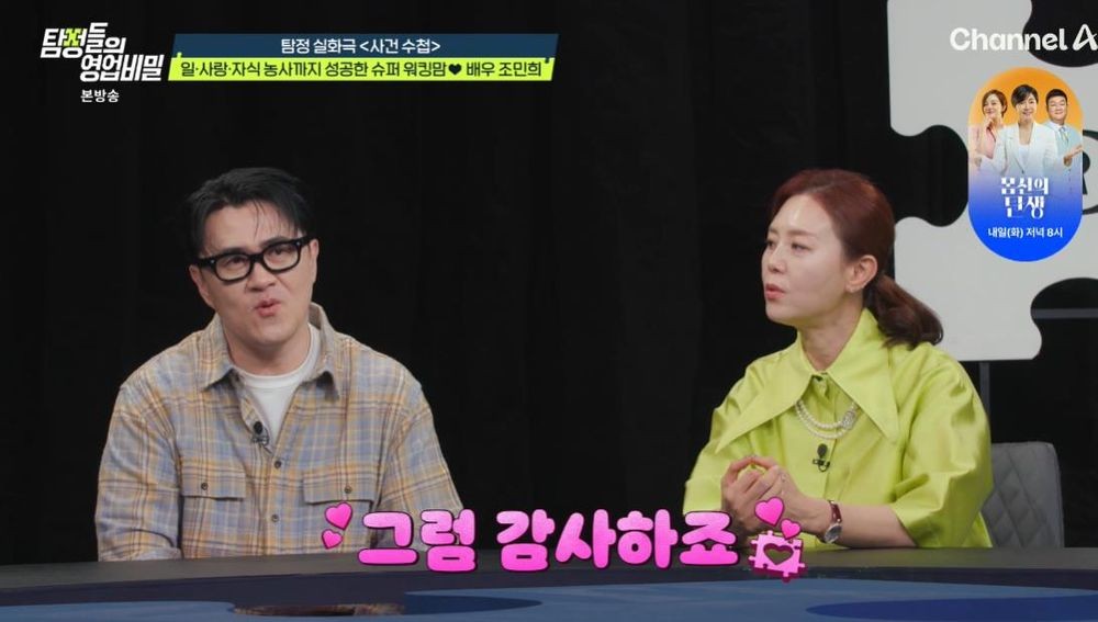 [TV리포트=한수지기자]배우조민희가데프콘을사위로점찍었다.23일방송된채널A'탐정들의영업비밀'속'사건수첩'에는슈퍼워킹만배우조민희가출연했다.이날데프콘은조민희의동안미모를보고는"너무고우셔서나이를가늠할수없다"라고칭찬했다.이에조민희는"올해나이57세가됐다"라며"자녀들을다키워서남편도그렇고오롯이저만신경쓰면되니까지금이인생의황금기다"라고밝혔다.이어"남편이전생에여러나라를구해서그런거니자기복이다"라고너스레를떨어웃음을자아냈다.또조민희는"데프콘이그렇게좋다"라며"나이가들면반점쟁이가되는데사람을딱보면대충견적이나온다.데프콘이진행하는걸보면예사롭지가않다.과한건눌러주면서워낙잘한다"라고칭찬했다.그러면서"외모적으로도남자는하관이다.말년복을의미하는데데프콘은하관이진짜좋다.아직결혼안하신분이있으면들이대시라"라고강력추천했다.이를듣던김풍은"데프콘같은분이사위로오면어떠냐"라고물었고,조민희는"너무감사하다"라고말했다.조민희의실제딸의나이는29살이라고.데프콘은"너무어려서안된다"라며손사레를쳤지만조민희는"그정도로좋은남자다"라고칭찬했다.남편에대한질문도나왔다.남편은과거방송에서집안에서손하나까딱안하며테토남중테토남스러운모습으로중년남성들의부러움을샀다.요즘에도그러냐는말에조민희는"요즘엔뒤에앉아서빨래를개고있다.얼마나아름다워보이는지모른다.나이가드니눈물도많아지고변하더라.이제는서로맞춰준다는개념이아니라남편의사용법을안다.궁금한거있으면전화하시라"라며웃었다.조민희는KBS공채탤런트출신이자,성형외과전문의권장덕과결혼해슬하에딸권영하를자녀로두고있다.한편,'사건수첩'"불륜으로이혼당한아들이재혼후에도또바람을피우는것같다"는한여성의다급한의뢰가등장했다.명성높은부부상담전문가인의뢰인은"제아들이두번이나바람을피워서이혼당했다는사실이알려지면누가저한테상담을받겠냐"며,며느리에게발각되기전외도증거를확보해조용히상황을정리하고싶다고털어놓았다.앞서의뢰인은아들의첫번째이혼당시,소문이퍼지는것을막기위해전며느리에게거액의위자료를지급하고비밀유지각서까지작성했던상황이었다.이후아들은이혼2년만에약사인초혼여성과재혼했다.사건을맡은탐정단은의뢰인아들의뒤를쫓기시작한다.겉으로보기에는헬스장과어머니가마련해준레스토랑을오가는단조로운일상이었지만,곧헬스장에가는척옆건물에위치한모텔로향하는수상한모습이포착됐다.조사결과의뢰인의아들은불륜녀와시간차를두고모텔을드나드는가하면,차량안에서밀회를즐기는등치밀하게외도를이어가고있었다.그러나진짜충격은불륜상대의정체가드러나면서시작됐다.불륜녀는본처의친구였다.불륜녀는친구가운영하는약국에찾아가피임약을구입하며"꼭남편이랑만하라는법있냐"고노골적인도발까지해모두를경악하게만들었다.결국의뢰인의노력에도아들의문란한사생활을막을수는없었고,의뢰인의며느리는이혼을선언했다.한수지기자[email protected]/사진=채널A'탐정들의영업비밀'Copyright©TV리포트.무단전재및재배포금지