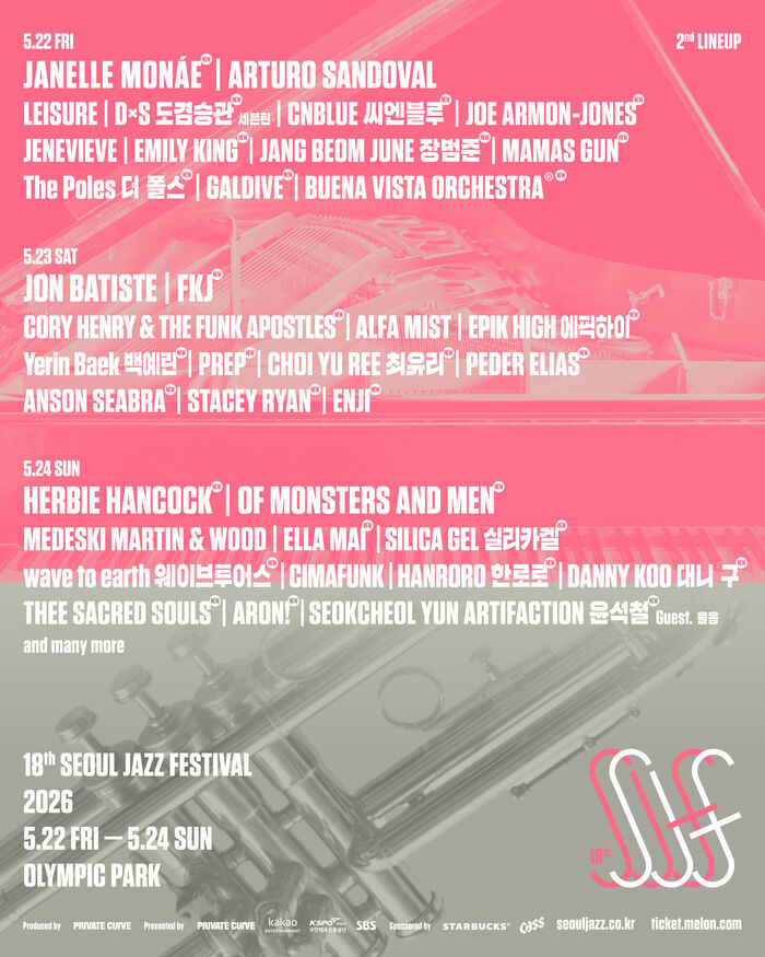 [SBS연예뉴스ㅣ강경윤기자]국내대표음악축제'제18회서울재즈페스티벌2026(The18thSeoulJazzFestival2026·이하서재페)'가2차라인업을공개하며글로벌아티스트총출동을예고했다.오는5월22일부터24일까지사흘간서울올림픽공원(88잔디마당,KSPODOME,티켓링크라이브아레나,88호수수변무대)에서열리는서재페는지난1월해외정상급재즈아티스트중심의1차라인업으로화제를모은데이어,2차라인업에30팀을추가발표하며기대감을끌어올렸다.이번2차라인업에는65년커리어와14회의그래미수상을자랑하는재즈계의전설허비행콕(HerbieHancock)을비롯해뉴프렌치하우스장르의개척자FKJ(프렌치키위주스),영국R&B싱어송라이터엘라마이(EllaMai),코리헨리&더펑크어파슬스(CoryHenry&theFunkApostles),인도네시아듀오갈다이브(Galdive),마마스건(MamasGun),프렙(PREP),페더엘리아스(PederElias)등이이름을올렸다.특히올해는서재페를통해처음한국을찾는아티스트들이대거포함됐다.자넬모네(JanelleMonáe),오브몬스터즈앤맨(OfMonstersandMen),조아몬-존스(JoeArmon-Jones),에밀리킹(EmilyKing),부에나비스타오케스트라(BuenaVistaOrchestra),앤슨세아브라(AnsonSeabra),스테이시라이언(StaceyRyan),디새크리드소울즈(TheeSacredSouls),엔지(Enji),애런!(aron!)등장르를넘나드는글로벌뮤지션들이한국관객과첫만남을갖는다.국내라인업역시화려하다.세븐틴(SEVENTEEN)메인보컬도겸·승관의유닛DxS를비롯해씨엔블루(CNBLUE),에픽하이(EpikHigh),백예린,실리카겔(SilicaGel),웨이브투어스(wavetoearth),장범준,최유리,한로로,대니구(DannyKoo),더폴스(ThePoles),윤석철Artifaction(Guest.율음)등이합류했다.재즈를기반으로록,R&B,힙합,클래식까지장르스펙트럼을확장하며'재즈'의외연을넓히겠다는서재페의방향성을보여준다.서재페는높은관객충성도로도주목받고있다.지난해12월오픈한블라인드티켓은30초만에매진됐고,1월얼리버드티켓역시1분만에완판됐다.3일권정가티켓은현재멜론티켓에서판매중이며,1일권티켓은3월3일(화)오후12시멜론티켓을통해단독오픈된다[email protected]©CopyrightⓒSBS.Allrightsreserved.무단전재,재배포및AI학습이용금지