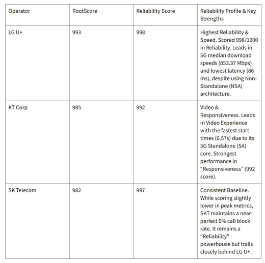 신뢰성998점…SKT·KT근소하게앞서[뉴스토마토이지은기자]LG유플러스(032640)가해외평가기관조사에서국내이동통신3사가운데네트워크신뢰성1위를차지했습니다.속도중심의5G경쟁이정체국면에접어든가운데,'끊김없는품질'이이통사의경쟁력을가르는핵심지표로부상하는모습입니다.5G시장에서1·2위사업자와의점유율격차를좁히고있는LG유플러스가품질경쟁력측면에서우위를확보했다는평가가나옵니다.24일글로벌네트워크성능평가기관우클라는'속도를넘어서-한국모바일네트워크신뢰성조사(BeyondSpeed-ExaminingMobileNetworkReliabilityinSouthKorea)'보고서를통해지난해하반기LG유플러스가신뢰성점수1000점만점에998점을기록했다고밝혔습니다.SK텔레콤(017670)은997점,KT(030200)는992점이었습니다.서비스안정성과속도,커버리지등을종합한전체점수에서도LG유플러스는993점으로가장높았습니다.뒤를이어KT는985점,SK텔레콤은982점을기록했습니다.국내이통3사신뢰성평가점수.(자료=우클라)이번조사는우클라산하루트메트릭스(RootMetrics)가지난해7~9월서울·인천·대전·광주·대구·부산등주요도시에서실내외환경을포함해6만3000건이상의테스트를진행한결과입니다.통화와데이터업·다운로드과정에서연결과완료성공여부를기준으로측정했습니다.LG유플러스는음성통화품질에서두드러졌습니다.통화연결까지걸린시간은0.77초로SK텔레콤(0.98초),KT(1.32초)보다빨랐습니다.통화차단건수는SK텔레콤과동일하게0건을기록했고,통화중예기치않게종료되는끊김비율은0.02%로SK텔레콤(0.10%),KT(0.25%)보다낮았습니다.데이터신뢰성에서도근소한우위를보였습니다.LG유플러스는다운로드접속성공률99.99%,업로드접속성공률100%를기록했습니다.SK텔레콤과KT역시99.94~100%수준으로높은신뢰도를보였습니다.특히다운로드와업로드작업실패율은각각0.08%,0.05%에그쳐SK텔레콤(0.16%,0.08%),KT(0.23%,0.14%)대비낮은수치를보였습니다.우클라는"접근성공과작업성공을종합평가해네트워크의실제사용안정성을측정했다"고설명했습니다.LG유플러스직원들이5G기지국을구축하고있다.(사진=뉴시스)5G시장에서도격차는점차좁혀지고있습니다.과학기술정보통신부의지난해12월무선통신서비스가입현황에따르면5G점유율은SK텔레콤45.5%,KT29.0%,LG유플러스24.2%입니다.KT와LG유플러스의격차는4.8%포인트로,2020년6.9%포인트,2021년5.6%포인트와비교해격차가점차줄어드는추세입니다.향후변수는5G단독모드(SA)전환입니다.과학기술정보통신부는올해3G·LTE주파수재할당대가를약15%인하하는조건으로5GSA전환을의무화했습니다.현재국내에서5GSA를상용화한사업자는KT뿐입니다.이에대해우클라는"최적화된비단독모드(NSA)네트워크를운영중인LG유플러스가지연시간(86밀리초)등일부반응속도지표에서여전히앞섰다"고분석하며"5GSA가영상시작속도등체감품질에서는장점을보였지만,지연시간개선효과는추가최적화가필요하다"고평가했습니다.이지은기자[email protected]