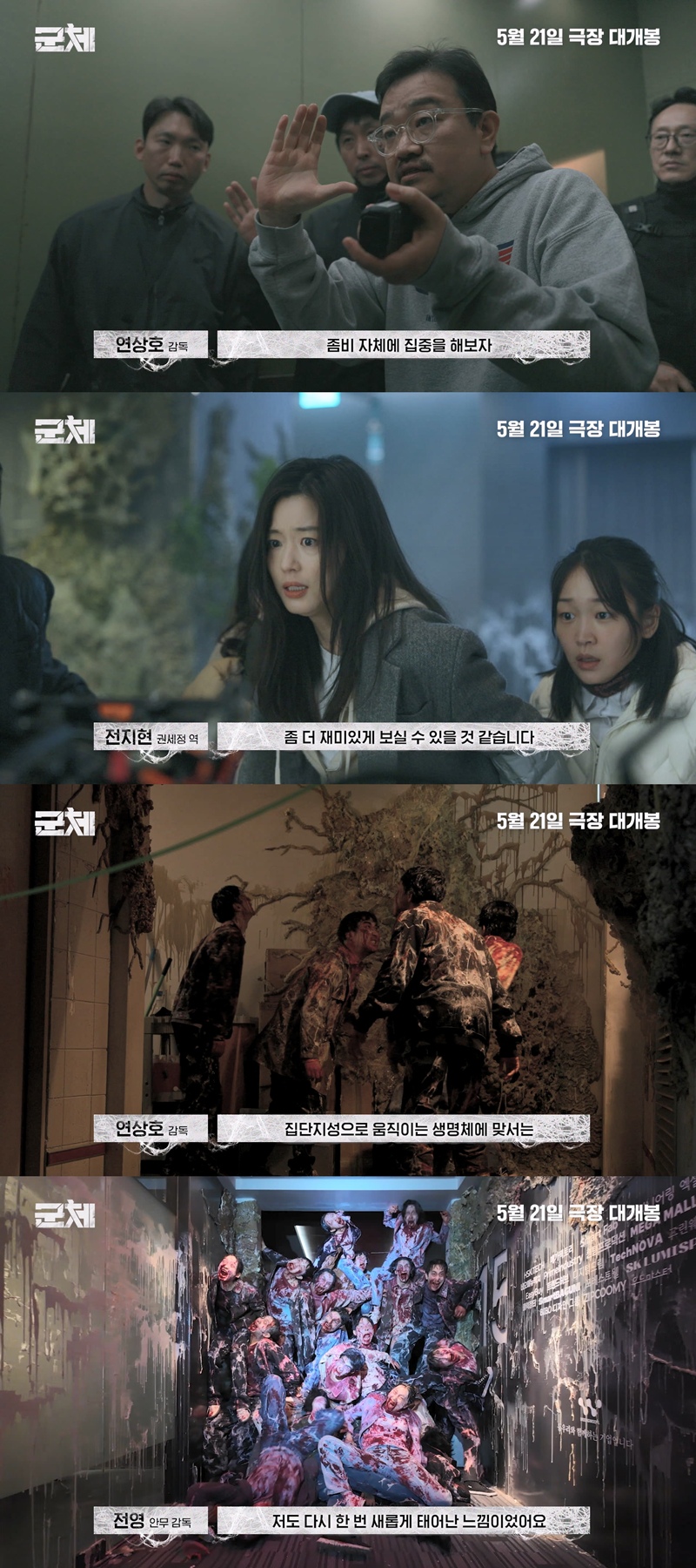 ▲'군체'새로운종(種)의탄생'제작기영상.제공|쇼박스[스포티비뉴스=김현록기자]연상호감독의신작영화'군체'가새로운좀비,업그레이드된감염자집단의탄생을알리는제작기를공개했다.정체불명의감염사태로봉쇄된건물안,고립된생존자들이예측할수없는형태로진화하는감염자들에맞서는영화'군체'가24일연상호감독과배우들이직접소개하는'새로운종(種)의탄생'제작기영상을공개하며,'군체'의탄생과정을상세히밝혔다.'군체의탄생'파트에는연상호감독이밝히는'군체'의시작과함께배우들이처음'군체'를접했을때의소감이담겼다.'부산행''반도'에이어세번째좀비물을선보이는연상호감독은"'부산행'은기차라고하는특수한공간안에서어떤일이생길것인가,'반도'는한반도라고하는고립된공간에서일어나는일들을다루고있다면'군체'를처음구상할때는좀비자체에집중을해보자라는생각을했던것같다"고연출의도를밝혔다.'부산행'과'반도'로명실상부한'좀비마스터'로자리잡은연상호감독이'군체'를통해어떤새로운좀비를선보일지는가장기대를모으는대목.배우들역시"'감염자들이업데이트된다는개념이재미있었다'"(구교환),"'감염자가움직이는모습이라든가행태들이이런방식으로표현된적은없었던것같다'"(신현빈)등대본을처음읽었을때의소감을전하며,연상호감독이탄생시킨'새로운종(種)'이영화속어떤모습으로표현될지호기심을자극한다.'군체를말하다'파트는'군체'만의재미와차별성을담았다.김신록은"'좀비와는좀다른감염자들을매개로한아포칼립스영화같은재미가있었다'"고말해지금까지의좀비와는다른감염자의등장과함께펼쳐질'군체'만의새로운세계를예고했다.연상호감독은"여러명이정보를교환하는모먼트들이있다.저희들은업데이트라고불렀다"고귀띔했다.또한"'현장에나와서연기를하다보니까생각보다엄청무서웠다'"는전지현의말에서드러나듯,'군체'는CG가아닌안무가와무용수들의분장과움직임으로감염자들의모습을표현하며한층생생한공포를완성했다.지창욱은"'굉장히새롭고재밌는경험'"이었다고전했으며,고수는"'어떻게영화화돼서보여질까궁금했다'"고밝혀궁금증을더했다.'새로운종(種)을완성하다'파트에서는'군체'속감염자들의새로운움직임을만들어낸전영안무감독과김수인안무가의열정이드러난다.감염직후온몸을뒤틀다네발로기는동작부터두발로일어나빠르게움직이는모습,생존자들을모방하는장면까지감염자들의업데이트와진화를보여주는기괴하고낯선움직임들은모두무용수들의연기로완성됐다.전영안무감독은"'어떻게사람이몸으로저런동작을표현을해?'정말기괴하고테크닉의끝이다.저도다시한번새롭게태어난느낌이었다"고밝혔다.영화'군체'는오는5월21일극장개봉예정이다.<저작권자ⓒSPOTVNEWS.무단전재및재배포금지>Copyright©스포티비뉴스.무단전재및재배포금지.