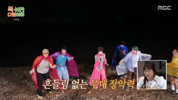 푹쉬면다행이야/사진=MBC캡처[스포츠투데이정예원기자]'푹쉬면다행이야'가무인도에서의아름다운밤을마무리했다.6일방송된MBC예능'푹쉬면다행이야'(이하'푹다행')에서는무인도에서해산물을잡아레스토랑을여는모습이그려졌다.푹쉬면다행이야/사진=MBC캡처이날붐은양세형과가수박지현,그룹오마이걸미미와무인도조업에나섰다.이들의눈앞엔영롱한은빛물결을뽐내는갈치들이잔뜩나타났다.이내붐은미미의상반신보다도긴대삼치를잡았다.그는"행복한추석보내세요"라며삼치를들고큰절을올렸다.이후순식간에두마리가추가됐다.'목포의아들'박지현도뜰채로튼실한삼치를건져올렸다.선장은"목포분이라그런지손목스냅이좋다"며칭찬을건넸다.박지현은"어릴때부터어머니를도와생선손질을했다.홍어는정말1만마리정도썰었다"며진정한'바다사나이'다운면모를드러냈다.이내그는선상에서삼치를즉석손질하며능숙한손놀림을보였다.박지현은까다로운생선껍질제거도한번에해냈다.옆에서지켜보던선장은"17년한저보다낫다"며치켜세웠다.여기에양세형은무늬오징어회에곁들일양념장을뚝딱만들어내며호화로운한상을완성했다.음식을맛본네사람은"너무맛있다"며감탄사를연발했다.특히양세형은"포실포실하면서쫄깃쫄깃하고,단맛이난다"는설명을덧붙였다.푹쉬면다행이야/사진=MBC캡처이후가수김연자가'푹다행'의막내일꾼으로등장했다.그는"정말많이잡고싶다"며의욕을보이다가도눈앞의해산물을보고는"이걸어떻게손으로잡냐"고겁냈다.김연자는살아있는해삼을잡았고,붐의도움으로즉석에서해삼을먹을수있게됐다.초장에찍어입에넣은김연자는눈이커지며"어떻게이렇게오도독거리냐"고감탄했다.이어ASMR도전에나섰다.그러나자꾸만말을크게해버렸고,"별표많이쏴달라"고해웃음을자아냈다.조업을끝내고'무인도레스토랑'으로향한이들은본격적인식사준비를시작했다.박지현은이번엔가위하나로갈치를손질하는발군의실력으로눈길을사로잡았다.정호영셰프는갈치삼치튀김을이용한유린기와촛대고둥해삼무침을요리했다.김연자는눈을번뜩이며"맛있다"고말했다.해가질무렵,정셰프는짜장을만들다"춘장이너무짜다"며설탕과물을들이부었다.결국짜장볶음에서짜장탕이돼버렸다.이때양세형은예리한눈썰미로"그거설탕이아니라맛소금아니냐"고말했다.알고보니박지현이설탕을달라는정셰프에게실수로소금을건넨것이었다.박지현은울기직전인표정을지으며자신이실수한것이라실토했고,"죽고싶었다"고속마음을드러냈다.결국재료를다시썰어짜장만들기재도전이이어졌다.이번엔소금이아닌설탕을제대로넣었고,완벽한맛의오징어누룽지짜장면이완성됐다.음식을맛있게먹은이들은김연자의특별무대로흥을올렸다.히트곡'아모르파티'에맞춰다함께춤을추는모습으로무인도에서의밤이막을내렸다.[스포츠투데이정예원기자[email protected]]Copyright©스포츠투데이.무단전재및재배포금지.