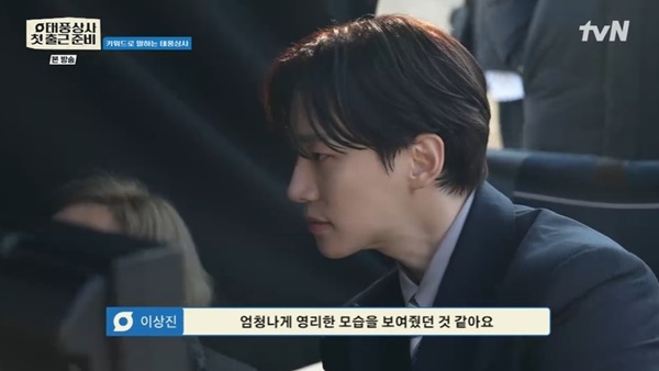 tvN‘태풍상사첫출근준비’tvN‘태풍상사첫출근준비’[뉴스엔유경상기자]이상진이이준호와강태풍역할의싱크로율이100%라며극찬했다.10월5일방송된tvN토일드라마'태풍상사‘스페셜’첫출근준비‘에서는배우김재화(차선택차장역)와이상진(배송중대리역)이비하인드를나눴다.주인공강태풍(이준호분)을한마디로표현해달라는질문에이상진은“짱돌?”이라고단단함을표현했고김재화가“강태풍이싫냐”고너스레를떨었다.이상진은“한단어로표현하기가어렵다.요상한인물이다.날카로우면서뭉툭하고비범한사람같다가도바보같다.한단어로표현하자면모르겠다”고설명했다.김재화는이준호와강태풍역할의싱크로율이100%라며“90년대유행한브릿지염색에귀걸이에가죽자켓을입은걸처음보니너무멋있어서소리가절로나왔다”고말했다.이상진도“(이준호가)신기하다.날라리스타일도어울리고갖춰입고사장님눈빛을장착하면사장님으로느껴지게연기를한다.몰입하기굉장히좋았다.애티튜드도시원시원한면이있다.싱크로율100%라고생각한다”고동의했다.또이준호의비하인드에대해이상진은“일단현장에서장난꾸러기다.농담도많이한다.촬영할시간이되면엄청나게영리한모습을보여준것같다.이렇게사람이영리할수있구나생각을많이했다”고말했다.김재화는이준호에대해“저희팀의리더다.배우들한명한명컨디션은어떤지세세하게두루살피고스태프도잘챙기고.그냥우리사장님”이라고애정을드러냈다.한편‘태풍상사’는10월11일토요일9시10분첫방송된다.(사진=tvN‘태풍상사첫출근준비’)뉴스엔유경상yooks@기사제보및보도자료[email protected]ⓒ뉴스엔.무단전재&재배포금지Copyright©뉴스엔.무단전재및재배포금지.