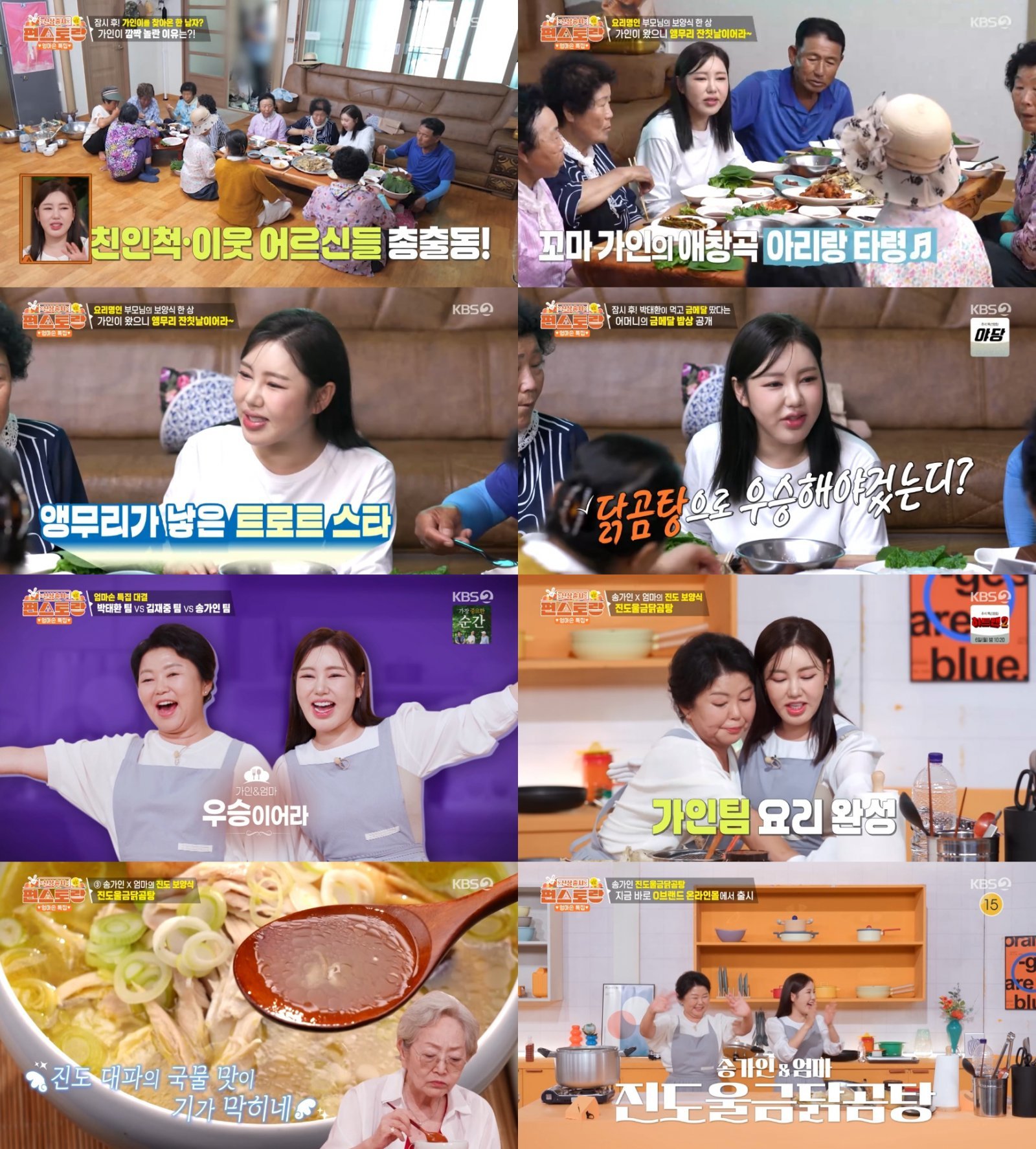 가수송가인이어머니와함께선보인‘진도울금닭곰탕’으로‘신상출시편스토랑’에서우승을차지했다.송가인은지난3일오후방송된KBS2예능프로그램‘신상출시편스토랑’(이하‘편스토랑’)에출연,어머니와함께치열한메뉴대결을펼친모습이그려졌다.이날방송은추석맞이‘엄마손특집’으로꾸며져어머니와함께팀을이뤄대결을펼치게됐다.이를위해송가인은서울에서6시간을달려진도본가에도착했으며,부모님은그런딸을위해광어회부터전복물회등정성을가득담은보양식한상을차렸다.특히아침부터토종닭을푹끓인닭곰탕이등장하자스튜디오는침을삼키는소리로가득찼다.전복에울금까지넣은닭곰탕이완성되자송가인은동네어르신을모두집으로모셔잔치를벌였다.어르신들은송가인에대해“어렸을때부터노래를그렇게잘했다”라며“지금은대한민국1등가수가됐다”라고뿌듯한마음을드러냈다.그렇게잔치를즐긴어르신들은대결메뉴로닭곰탕을선택했다.이후송가인은어머니와함께서울스튜디오로올라와‘우승이어라’팀을구성해대결을펼쳤다.‘우승이어라’팀은박태환,김재중가족에이어마지막으로‘진도울금닭곰탕’을완성했지만,심사위원들에게“맛이고급스럽다”,“알고있는닭곰탕맛과다르다”,“풍미의깊이가다르다”라며극찬을받았다.이연복심사위원이“집에도망가고싶다”라고속내를밝힐정도로쟁쟁한대결이펼쳐진가운데,송가인과어머니는‘진도울금닭곰탕’으로‘엄마손특집’에서우승을차지했다.김겨울기자[email protected]©스포츠동아.무단전재및재배포금지.