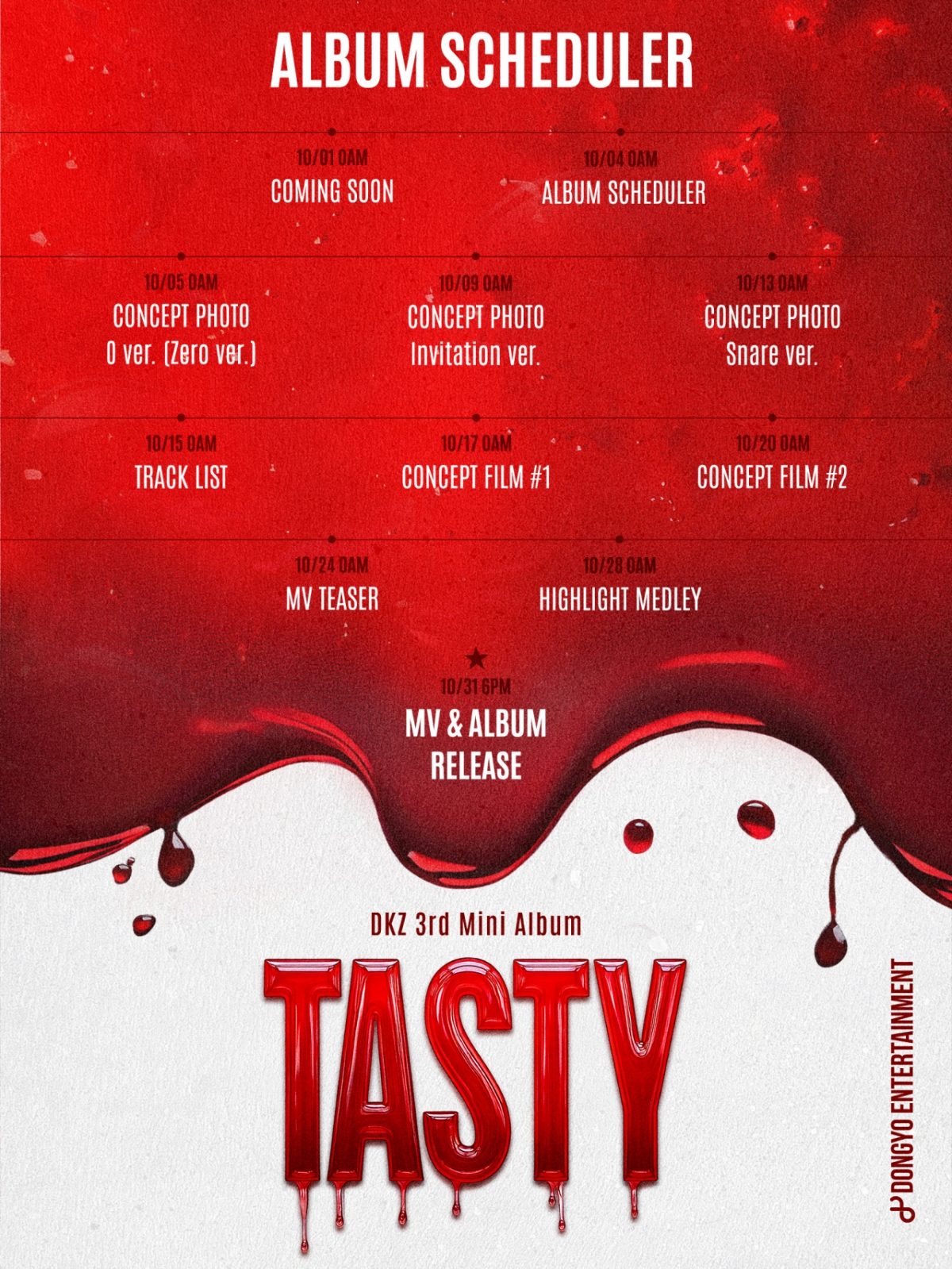 [스타뉴스|문완식기자]/사진=동요엔터테인먼트그룹DKZ(디케이지)가새앨범스케줄러를공개하며본격컴백카운트다운에돌입했다.DKZ(세현,민규,재찬,종형,기석)는4일0시공식SNS를통해미니3집'TASTY'의스케줄러를게재했다.공개된스케줄러이미지는치명적이면서도매혹적인분위기속붉은색의액체가흘러내리고있는모습이담겨눈길을끈다.이에따르면,DKZ는오는5일콘셉트포토를시작으로트랙리스트,콘셉트필름,뮤직비디오티저,하이라이트메들리등다채로운콘텐츠로컴백주간을풍성하게채운다.특히DKZ는Zero,Invitation,Snare등세가지버전의콘셉트포토를순차공개한다.기존의DKZ에게서볼수없던매력을집약해팬들에게'TASTY'한면모를선사할예정이다.'TASTY'는DKZ가전작인미니2집'REBOOT'발매이후약1년6개월만에내놓는새앨범이다.DKZ는'TASTY'라는앨범타이틀처럼,보고듣는재미를음악과퍼포먼스에담아내컴백기대감을더한다.한편,DKZ의미니3집'TASTY'는오는31일오후6시각종음원사이트를통해발매된다.문완식기자[email protected]©스타뉴스&starnewskorea.com,무단전재및재배포금지