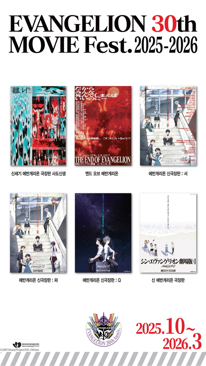 '에반게리온30주년기념무비페스티벌2025-2026'오는31일부터2026년3월5일까지CGV개최(MHN장민수기자)인기애니메이션'에반게리온'이30주년을맞아'무비페스티벌2025-2026'을개최하고팬들과만난다.오는31일부터2026년3월5일까지CGV단독으로열리는이번상영회에서는지금까지개봉한모든극장판을스크린에서다시볼수있다.특히'신세기에반게리온극장판사도신생'이국내최초로상영된다.'사도신생(シト新生,DEATH&REBIRTH)'의후속작품으로,시리즈를대표하는명곡중하나인엔딩곡'혼의루프란'을스크린에서감상할수있다.1995년첫방송된TV시리즈'신세기에반게리온'은거대병기에반게리온초호기의파일럿이된소년이카리신지의이야기를그린작품이다.독창적연출과메시지로전세계에열광적인붐을일으켰다.TV시리즈이후극장판'신세기에반게리온극장판사도신생''엔드오브에반게리온'이공개됐고,안노히데아키감독이기획,각본,총감독을맡은'에반게리온신극장판'시리즈는2007년'에반게리온신극장판:서'를시작으로'에반게리온신극장판:파''에반게리온신극장판:Q'를거쳐2021년'신에반게리온극장판'으로마무리됐다.이번상영회에서는신세기판,신극장판을모두순차상영하며,'신세기에반게리온극장판사도신생'은28년만에국내첫개봉을맞이한다.이어'엔드오브에반게리온'과'에반게리온신극장판'4부작모두스크린에서만나볼수있다.총6편이상영되는이번30주년기념무비페스티벌은모든영화가단3주간씩만상영된다.사진=미라지엔터테인먼트Copyright©MHN.무단전재및재배포금지.