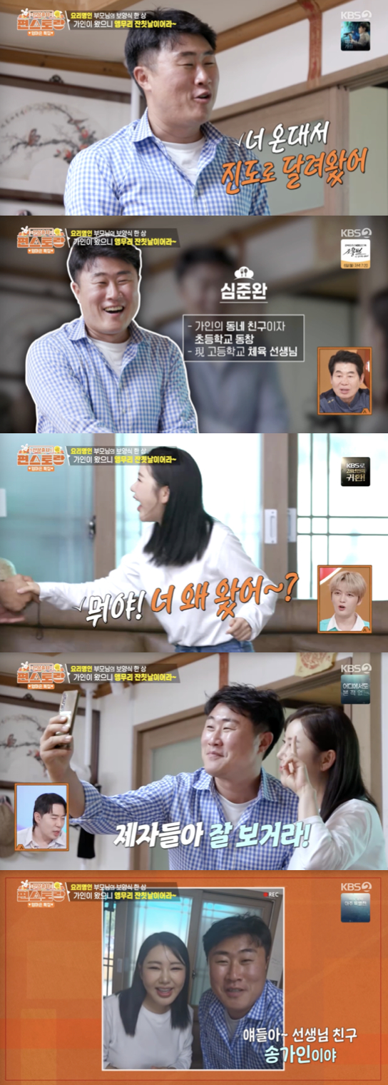[스타뉴스|정은채기자]/사진='편스토랑'방송화면캡쳐가수송가인의초등학교시절부터함께해온남사친이공개돼눈길을끌었다.3일방송된KBS2TV'신상출시편스토랑'은추석을맞아'엄마손특집'3편으로꾸며졌다.이날방송에서는트로트여신송가인이고향전남진도를찾아부모님과함께하는훈훈한일상이전파를탔다.그런가운데건장한체격에남친룩을차려입은한남성이등장하자송가인은반갑게웃으며"너왜왔어!"라고인사를건넸다.이어다정하게악수를나누며남다른친분을드러냈다.이남성은다름아닌송가인의초등학교시절부터알고지낸동네친구로,현재는중학교교사로재직중인인물이었다.그는"광주에서모임있다가너가온대서보려고달려왔다.보고싶어서"라며오랜친구를향한애정을드러냈다.또"학생들이우리가친구인걸안믿는다.사진좀하나찍어달라"라며제자들에게보여줄인증샷을요청해웃음을자아냈다.이에송가인은"진짜친구맞으니까믿어주세요"라며학생들을향해센스넘치는영상멘트를남겼다.정은채기자[email protected]©스타뉴스&starnewskorea.com,무단전재및재배포금지