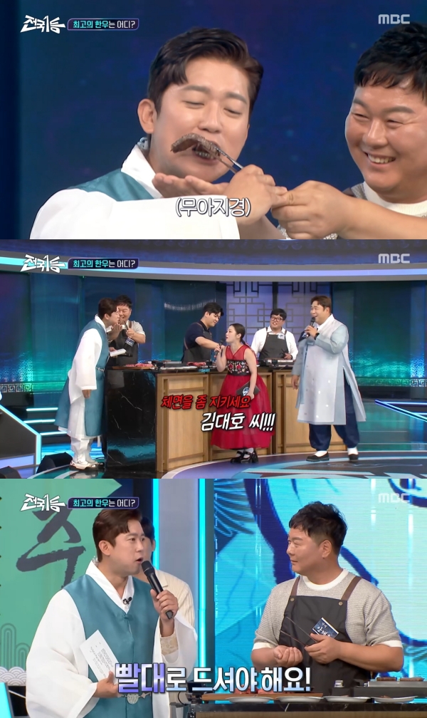 사진=MBC[스포츠투데이김태형기자]박나래가김대호에게"체면을지키라"고쓴소리했다.3일첫방송된MBC추석특집'전국1등'에는국내최초'특산물챔피언스리그'라는파격적인콘셉트로,충남홍성·경기안성·제주흑우가대한민국최고한우자리를놓고자존심대결에나선모습이그려졌다.이날제주는흑우등심,홍성은안창살,안성은살치살,새우살,안심,치마살로승부했다.김대호는안성팀이건넨큰새우살부위를정신없이먹었다.이모습을본박나래가"체면을좀지키라"며"이러려고프리하신거냐"고외쳐웃음을자아냈다.김대호는말을잇지못하다가"안성한우는빨대로드셔야한다.육즙이…"라며감탄했다.[스포츠투데이김태형기자[email protected]]Copyright©스포츠투데이.무단전재및재배포금지.