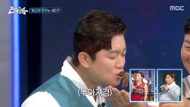 MBC‘전국1등’캡처MBC‘전국1등’캡처[뉴스엔서유나기자]방송인박나래가아나운서출신방송인김대호의먹방에쓴소리를했다.10월3일방송된MBC추석특집예능'전국1등'1회에서는대한민국최고한우의자리를놓고자존심대결이펼쳐졌다.이날전국1등타이틀을차지하기위해출격한세지역은홍성,안성,제주였다.박나래는홍성,문세윤은안성,김대호는제주팀을맡았다.세MC는적을알아야한다며상대팀고기를한점씩먹어보기로했다.이중김대호는거대한안성새우살을맛보게됐고무아지경먹방을선보이는김대호에박나래는"체면좀지키라.이러려고프리하신거냐.프리하게드신다"고한마디했다.이어반질반질한입술에"어머립밤바른거봐"라며깜짝놀랐다.김대호는박나래가"말을해달라"며답답해하자"안성한우는빨대로드셔야한다"고육즙을극찬했다.뉴스엔서유나stranger77@기사제보및보도자료[email protected]ⓒ뉴스엔.무단전재&재배포금지Copyright©뉴스엔.무단전재및재배포금지.