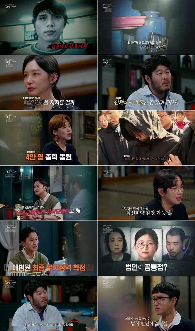 SBS‘꼬리에꼬리를무는그날이야기’캡처[뉴스엔이민지기자]'꼬꼬무'가‘김길태살인사건’을통해제도적허점을짚었다.10월2일방송된SBS‘꼬리에꼬리를무는그날이야기’(이하'꼬꼬무')는‘김길태와암흑대왕’편으로,배우신소율,김기방,조우진이리스너로참여했다.이날방송된김길태의범행은2001년으로거슬러올라갔다.새벽기도를가던한여성을흉기로협박해옥탑방으로끌고간그는무려9일동안감금해성폭행했다.법정에서김길태는범행을전면부인했다.그러나옥탑방은감금에최적화된구조였고,피해자는“흉기로위협당해겨우탈출했다”고증언했다.결국법원은그에게징역8년을선고했다.하지만이판결은그의재범을막지못했다.8년복역후출소한그는불과1년만에여중생살인사건과20대여성성폭행사건의피의자로다시법정에섰다.2010년3월,부산사상구에서13살여중생이실종됐다.수색끝에시신은인근물탱크에서발견됐다.현장에서확보된족적은김길태의운동화와일치했고,그는이미또다른성폭행사건으로수배중이었다.경찰은결국그를공개수배했다.김길태가거주지인근에서범행을저지르며부산일대를공포에빠뜨리는모습에,신소율은“너무무섭다.저라면집밖에못나갈것”이라며“무서운것도무서운거지만동네사람을의심하게되고작은일에도불안해진다”며공포를전했다.이야기중김길태와부모님의관계는더욱큰충격을안겼다.김길태는갓난아기시절교회앞에버려져현재의양부모에게입양되어키워진것.그러나김길태는17세이후소년원과교도소를전전했고,범행이알려질때마다부모는고통에시달렸다.모친은“자수해라,잘못을인정하라”고호소했다.신소율은“부모님의억장이무너질듯하다”며안타까움을전했다.결국,형사총동원령이내려지고4만명이투입된끝에김길태가사건발생14일만에붙잡혔다.조우진은“나같으면눈물이날것같다.얼마나많은사람들이슬프고,고통스럽고,분노했을지감정이휘몰아쳤을것이다”라며심정을대변했다.그러나조사과정에서김길태는“술을마셔기억이없다”고주장했다.경찰은프로파일러권일용을투입했고,결국김길태는범행을털어놨지만그의자백은앞뒤가맞지않았다.이에‘꼬꼬무’가당시의자백내용을최초공개했다.그는“술에취해정신을잃었고,눈을떠보니시신이있었다”고주장하며살인을부인했다.또물탱크에서발견된시신을시멘트와벽돌로덮은이유에대해서는“불쌍해서였다”고진술했다.검찰은강간살인혐의로기소하고사형을구형했다.그러나김길태는항소하며“환청과환각에시달렸고‘암흑대왕이시켰다’”라며심신미약을주장했다.이에김기방은“최악이다”라고분노했다.김길태를진찰한법무부치료감호소는뇌전증가능성과환각·환청경험을언급했지만,서울대병원은뇌전증과망상장애모두불확실하다고결론내렸다.다만반사회적성격장애는분명하다고지적했다.재판부의판단은갈렸다.1심은사형을선고했으나2심은우발적범행에가까우며정신상태가완전히정상이라단정하기어렵다며감형했다.대법원은무기징역을확정했다.장도연,장현성,장성규3MC는‘심신미약’제도의허점을지적하며“용서를받지못할범죄를저지르고도처벌을피하려는거짓말이없도록더많은고민이필요하다”고입을모았다.김기방은“우리나라는심신미약에관대한것같다”고지적했고,조우진은“사회적약자를향한중범죄에서심신미약이처벌을가볍게할근거가될수있는지.피해자에게등돌리는판단이절대있어서는안된다”며개선을촉구했다.뉴스엔이민지oing@기사제보및보도자료[email protected]ⓒ뉴스엔.무단전재&재배포금지Copyright©뉴스엔.무단전재및재배포금지.