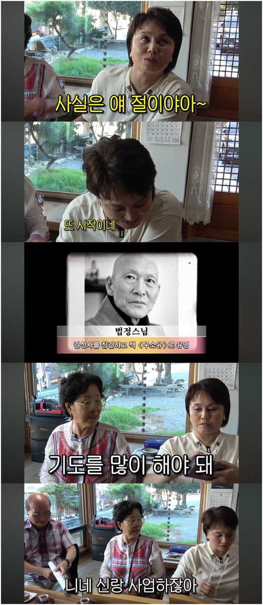 [OSEN=오세진기자]‘순풍선우용여’배우선우용여가후배연예인이경실에게조언했다.1일배우선우용여의유튜브에서는‘18년찐친선우용여와이경실이여행중실제로싸우는이유(+오열)’란영상이공개됐다.이들은지난주에이어군산여행을이어갔다.신실한불자인선우용여를위해이경실은군산의동국사를찾았다.절관계자및총무스님과차를마시며기쁨을감추지못하는선우용여의표정은편안했다.선우용여는“저는기도하는스님을사랑해.전비즈니스스님은싫어요”라며“이경실이동국대를나왔다”라면서총무스님에대한사랑을보내며이경실을자랑했다.이경실은“내가이래서선우용여랑다니면‘얘동국대나왔어요.교회다니는데사실은절이다’라고한다”라며밝혔다.절에서는이들에게법정스님필체의족자를선물했다.선우용여는“너잘간직해라.너신랑사업하잖아.넌기도를많이해야한다”라며이경실에게조언해웃음을안겼다./[email protected][사진출처]선우용여채널Copyright©OSEN.무단전재및재배포금지.