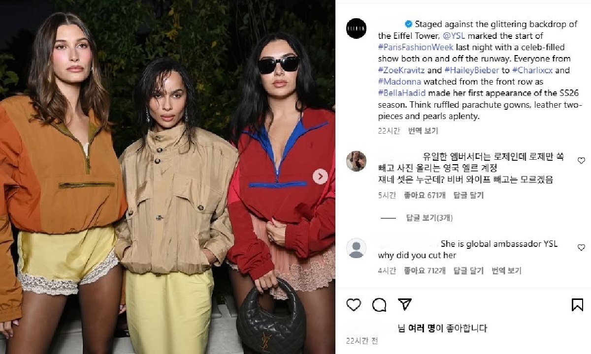 영국유명패션매거진‘엘르UK’가의도적으로로제만편집한사진을업로드해인종차별논란이불거졌다.‘엘르UK’SNS캡처영국의패션매거진‘엘르UK’와싱어송라이터찰리xcx가그룹블랙핑크멤버로제를“인종차별한게아니냐”라는논란이불거졌다.지난달30일(현지시각)영국의패션매거진엘르UK는공식SNS를통해전날인지난달29일프랑스파리에서열린‘생로랑2026SS패션쇼’에서촬영한사진들을게재했다.패션쇼당일로제는생로랑의공식글로벌앰배서더로참석해잉글랜드출신의싱어송라이터찰리xcx,모델헤일리비버,모델겸배우조이크라비츠와함께자리를빛냈다.로제는2020년생로랑패션의글로벌앰배서더로발탁된이후로브랜드의상징으로자리잡으며,‘인간생로랑’이라는별명을얻을만큼브랜드와시너지를극대화했다.영국출신싱어송라이터‘찰리xcx’역시티가날정도로로제만어둡게음영처리한사진을업로드해인종차별논란에휩싸였다.‘찰리xcx’SNS캡처다만문제는엘르UK가SNS에4명이함께찍은사진에서로제만잘라편집한사진을공개했다는것이다.이외에도엘르UK가앰배서더인로제를제외하고참가자대부분의사진은공개했다는점에서국내외네티즌들사이에서“엘르UK가일부러인종차별적인의도를가지고로제를패싱한것아니냐”라는의혹이제기되면서일파만파확산됐다.특히로제옆자리에서함께사진을촬영한찰리xcx역시자신의SNS에논란이된사진의원본을티가날정도로로제만어둡게음영처리한사진으로업로드해인종차별논란에더욱불을지폈다.이를접한국내외네티즌들은엘르UK의SNS에“영국패션매거진이로제를의도적으로패싱했다”,“로제가글로벌앰배서더인데왜그녀만편집했나”,“백인들만나오게편집한의도뻔하다”,“이것은노골적인인종차별”등의댓글을남기며항의했다.로제는생로랑글로벌앰배서더로맹활약하고있다.로제SNS캡처확산된의혹에도엘르UK와찰리xcx는사진을내리거나별다른입장을내놓지않고있어네티즌들의분노를사고있다.특히엘르UK는공식계정이라는점과글로벌매거진으로서의영향력을고려했을때,인종차별적의도가담긴게시물업로드에대한비판여론을피하기어려울것으로보인다.서혜주온라인뉴스기자[email protected]©세계일보.무단전재및재배포금지.