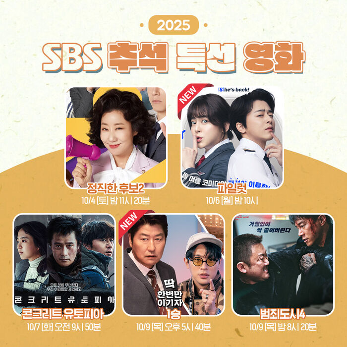 [SBS연예뉴스|강선애기자]2025년추석연휴기간동안SBS가코미디부터재난스릴러,액션까지다양한장르의영화를선보인다.라미란의'정직한후보2',조정석의'파일럿',이병헌박서준박보영의'콘크리트유토피아',송강호박정민의'1승',마동석의'범죄도시4'등5편을안방극장에서방영한다.▲'정직한후보2'-10/4,토요일밤11시20분서울시장낙선후백수가된주상숙(라미란분)이우연히또한명의'진실의주둥이'박희철(김무열분)과함께거짓말을못하게되면서벌어지는좌충우돌코미디를그린다.장유정감독과라미란,김무열,윤경호등전편의주역들이다시뭉치고박진주,서현우,윤두준등뉴페이스가합류하여더욱강력해진웃음과신선한케미를선사한다.웃음만을주는것을넘어,현실을꿰뚫는사이다같은대사들로시청자들에게짜릿한카타르시스와함께통쾌한재미를안겨준다.▲'파일럿'-10/6,월요일밤10시영화'파일럿'은한순간모든것을잃은스타파일럿한정우(조정석분)가재취업을위해여동생의이름으로'한정미'가되어여성파일럿으로새로운삶을살아가는이야기다.조정석은여성으로완벽하게변신한모습으로파격적인비주얼과함께특유의능청스러운코믹연기를선보이며시종일관시청자들의웃음을자극한다.여장을통해예상치못한난관과편견에부딪히며성장하는'한정미'의모습은단순한웃음을넘어진정한'나'를찾아가는과정에대한유쾌한성찰을담고있다.▲'콘크리트유토피아'-10/7,화요일오전9시50분대지진으로모든것이무너진서울에서유일하게남은황궁아파트를배경으로,외부인들의생존을위한침입에맞서주민들이벌이는사투와변화를그린다.극한의상황속에서드러나는인간의본성과생존을향한처절한욕망을통해시청자들에게깊은질문과몰입감을선사한다.이병헌,박서준,박보영등탄탄한배우진의열연이더해져재난스릴러의새로운지평을열었다고평가받고있다.▲'1승'-10/9,목요일오후5시40분단한번도이겨본적없는감독(송강호),이길생각없는구단주(박정민)그리고승리방법을모르는선수들이뭉쳐유쾌하고통쾌한1승을향해나아가는과정을그린다.신연식감독이연출하고송강호,박정민등연기파배우들이대거출연하여따뜻한웃음과감동,짜릿한쾌감까지선사하며시청자들의뜨거운호평을받았다.대한민국영화최초로프로배구를소재로한'1승'은지친이들에게희망의메시지를전한다.▲'범죄도시4'-10/9,목요일밤8시20분전편에이어'범죄도시4'에서도괴력의형사마석도(마동석)가국경을넘나드는글로벌범죄조직을소탕하기위해나선가운데,시리즈역대최강빌런백창기(김무열)와예측불허의조력자장이수(박지환)의활약이더해져긴장감과재미를높였다.시청자들의폭발적인호응속에한국영화사상최초로세편의천만영화를기록한'범죄도시'시리즈는시원한카타르시스와짜릿한액션으로지친일상에통쾌한활력을선사한다.강선애기자[email protected]©CopyrightⓒSBS.Allrightsreserved.무단전재,재배포및AI학습이용금지