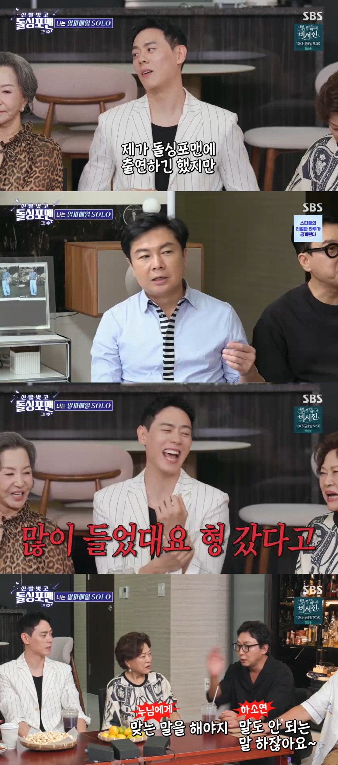 [스타뉴스|안윤지기자]/사진=SBS'돌싱포맨'방송캡처'돌싱포맨'농구선수이관희가연애와관련해자신감을보였다.30일방송된SBS예능프로그램'신발벗고돌싱포맨'에서는'K-독기헌터스'특집으로김용림,서권순,이관희가게스트로출연했다.탁재훈은"관희너도어려서그렇지,결혼하면백퍼센트이혼남이다"라고말하자,이관희는"그런얘기많이들었다"라고말해웃음을자아냈다.이상민은이관희에대해"자신감이대단하다.'돌싱포맨'형들두배를합쳐도나만큼대시못받아봤을거라고했다"라고했다.이관희는"사실이다.내가'돌싱포맨'에나왔지만,형들과엮일급이아니다.형들을봤을때네분중에서(원희)형님은논외다.연애레벨로놓고봤을때다"라고말했다.이어"그다음이(김준호)형님이다.전형적인잘나가는애옆에붙어다니는사람이다"라고전했다.또한"다음레벨이재훈이형님이다.내가선수다보니까선수는선수를알아본다.대화를해보면(이상민은)소신적에나와비슷할거같다고생각한다.근데(탁재훈은)많이갔기때문에시계정도차야하는느낌이다"라고말해폭소케했다.탁재훈은"맞는말을하면그렇다고하겠는데다른말을한다"라고반응했다.이상민은"(이관희는)사실농구계에박보검이다"라고칭찬하자김용림은"맞다.나도아까괜찮다고했었다"라고덧붙였다.한편'돌싱포맨'은매주화요일오후10시40분에방송된다.안윤지기자[email protected]©스타뉴스&starnewskorea.com,무단전재및재배포금지