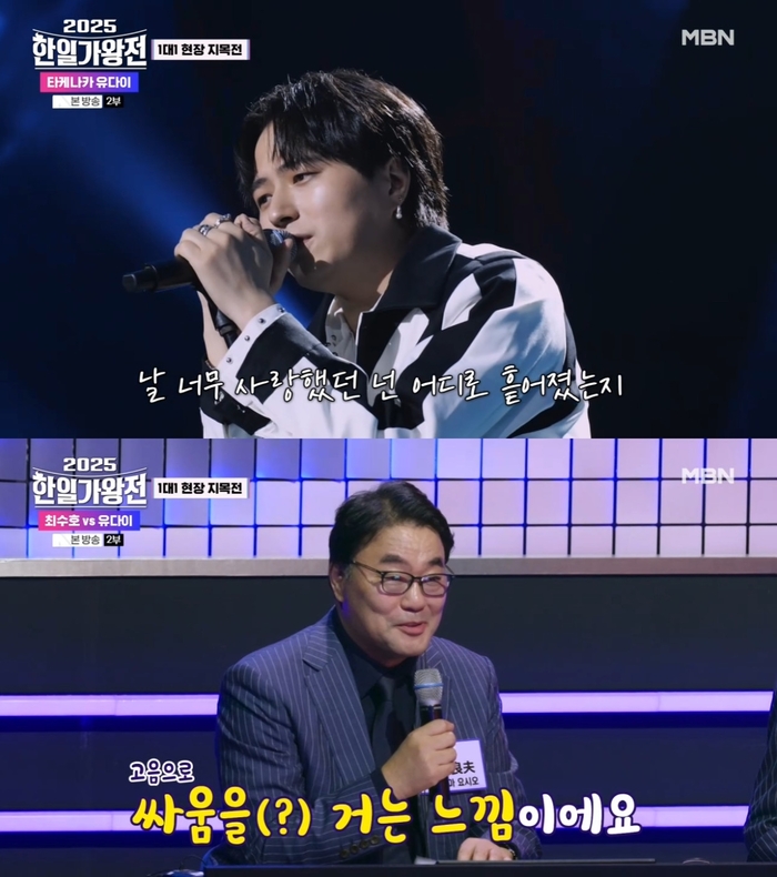 ‘2025한일가왕전’.사진IMBN‘2025한일가왕전’방송캡처가수유다이가우즈의‘드라우닝’을열창했다.30일방송된MBN‘2025한일가왕전’에서는한일TOP7의자존심을건승부의피날레를장식할본선3차전이그려졌다.이날최수호는대결상대로유다이를뽑았다.무대에앞서유다이는“‘진짜노래잘한다’라는생각이들도록압도적으로승리하고싶다”고바람을드러냈다.유다이는우즈의‘드라우닝’(Drowning)을선곡했다.예상외의선곡에국민판정단은입을틀어막고놀란모습을보였다.유다이는시원하게뻗는고음으로눈길을끌었다.이에요시오는“유다이는‘이건어떠냐’느낌이다.고음으로싸움을거는느낌이다.그모습이정말대단하다.‘이게바로유다이구나’생각했다”고칭찬했다.[이세빈스타투데이객원기자]Copyright©스타투데이.무단전재,재배포및AI학습이용금지