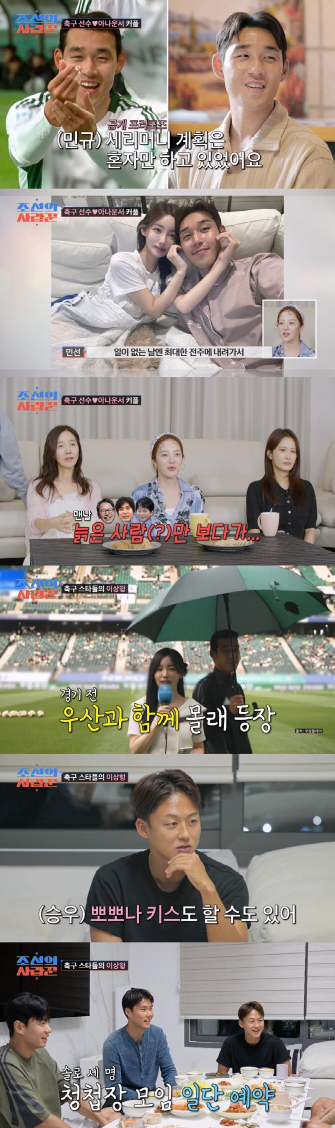'조선의사랑꾼'송민규·곽민선합류[이데일리스타in김가영기자]TV조선‘조선의사랑꾼’에‘7살연상연하커플’이자아나운서와축구선수예비부부인곽민선송민규가새로운사랑꾼으로합류했다.29일방송된‘조선의사랑꾼’에서는항저우아시안게임금메달의주역중하나이자,K리그의스타공격수송민규가‘7살연상’스포츠아나운서인‘축구여신’곽민선과함께새로운사랑꾼으로합류했다.두사람의풋풋한연애시절자료영상이공개되자,황보라는“나도스포츠아나운서할걸”이라며부러움을드러냈다.두사람은5년전방송인터뷰로처음알게됐고,21살의풋풋한송민규가먼저연락하면서연인으로발전했다.곽민선은“이관계가노출됐을때,민규가신경쓸일이생길까봐숨기려고노력했다”며비밀연애의순간을공유했다.김지민은“축구팬들이많으니까성적이조금만부진해도연애탓을했을것”이라며공감했다.축구경기장에서수만명의팬들이지켜보는가운데,송민규가골세리머니로곽민선에게프러포즈를하는자료영상이공개됐다.다른행사로현장에없었던곽민선은“아예몰랐다.행사끝나고팬들이랑같이있는데(팬들이)‘누나,결혼해요?’라고물어봤다.회사와친구들에게전화가많이와있었다”고그날을회상했다.이어,프러포즈세리머니다음날송민규가곽민선에게결혼을약속하는정식프러포즈를한사실도공개됐다.곽민선은전북현대모터스FC소속송민규를위해전주에서예비신혼집을꾸리고,서울을오가며활동중이다.VCR에선잠옷바람으로제작진을맞이한두사람이MZ신혼부부의애정넘치는공간을공개했다.황보라는“늙은사람들(?)만보다가오랜만에젊은사람결혼하는것보니까다르네”라며감탄해웃음을자아냈다.송민규가소속된축구팀전북현대모터스FC의전진우·이승우·송범근이신혼집집들이를위해출격했다.곽민선은축구선수들을위해전복등스태미나에좋은음식을손수준비했다.신혼집들이가처음이라는셋은어색한공기속에음식을폭풍흡입했다.대화가시작되자둘의연애시절,송민규가방송중인곽민선의뒤로접근해우산으로햇빛을가려주거나,같은날인터뷰를시도한곽민선을끌어안은사건이화두에올랐다.이에이승우는“나는결혼할분이었다면,더깊은스킨십까지했을것같다”고자신해웃음을자아냈다.외로운선수들을위해송민규는청첩장모임을빙자해지인들과‘자만추’소개팅을시켜주기로약속했다.이승우는이민정이이상형이라고밝혔으며전진우는고준희를이상형으로꼽았다.앞서이미주와공개열애후결별한송범근은“착한사람을좋아한다.외적으로는청순한이미지를좋아한다”고말했다.김가영([email protected])Copyright©이데일리.무단전재및재배포금지.