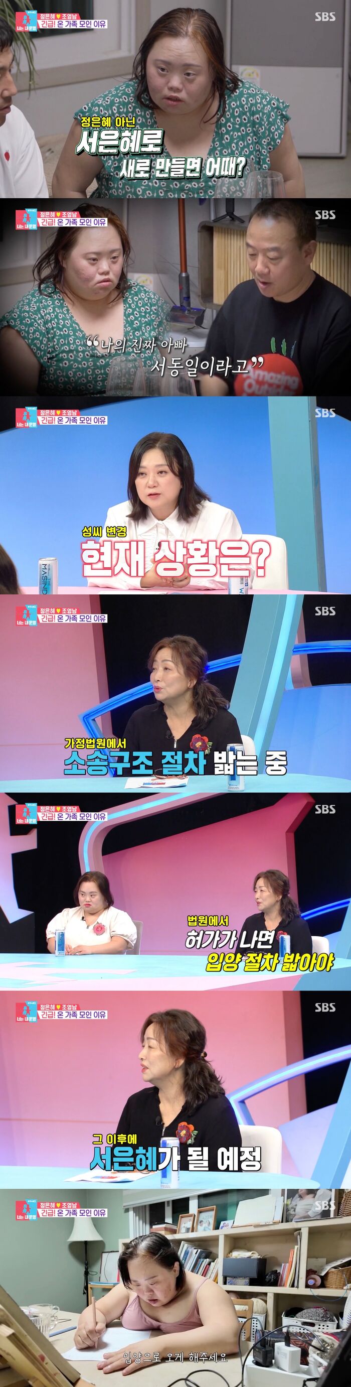 [SBS연예뉴스|김효정에디터]정은혜가서은혜가되는과정을소개했다.29일방송된SBS'동상이몽시즌2-너는내운명'(이하'동상이몽2')에서는정은혜조영남부부의일상이공개됐다.이날김숙은지난방송에서언급된정은혜가서은혜가된다는이야기를했다.당시정은혜는직접이제서은혜가되면어떠냐고물었고,정은혜의어머니는"나의진짜아빠서동일이라고"라며정은혜가가지고있는진심을대신언급했던바있다.이에김숙은어떻게진행중이냐고물었다.정은혜어머니는"소송구조절차를밟는중이다.은혜가성인이라부모동의없이입양신고가가능하도록허가신청서를법원에제출했다.허가가나오면입양절차를밟을예정이다.그리고그후에서은혜로성을바꿀수있을것같다"라고설명했다.그리고방송에서는입양신고를위해직접진술서를작성한정은혜의모습이공개됐다.정은혜는"저의진짜친아빠는서동일입니다.제아빠서동일에게입양으로오게해주세요"라고진심을담아진술서를작성해눈길을끌었다.Copyright©CopyrightⓒSBS.Allrightsreserved.무단전재,재배포및AI학습이용금지