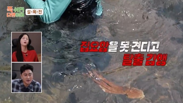 MBC‘푹쉬면다행이야’캡처MBC‘푹쉬면다행이야’캡처[뉴스엔유경상기자]문어탈출현장이목격되며모두의말문이막힌가운데이민우가해결사에등극했다.9월29일방송된MBC‘푹쉬면다행이야’(이하‘푹다행’)에서는이연복,유희관,문정희,이민우,신종철이무인도로향했다.무인도레스토랑둘째날이연복은간절히문어가잡히기를바랐다.전날에는안타깝게문어를놓친상황.이연복은무인도에올때마다금어기라문어를잡지못했다며“잡았으면메뉴에도움이될텐데정말속상했다”고말했다.이민우는바위틈에서물컹한뭔가를느끼고집요한수색을시작했고,잠시이민우가숨을돌리는사위바위틈에서문어가나와도망을가는현장이스튜디오에있는사람들에게포착되며탄식을자아냈다.홀연히탈출을감행하는문어의모습에모두의말문이턱막힌상황.이민우가도망가는문어를포착하고바로몸을날리며해결사에등극했다.이민우는민첩하게문어를사로잡았고,문어가또도망가자손으로움켜쥐며제대로포획했다.안정환이“새신랑기운이좋다”고감탄했고이연복도이민우의실력을인정하며기뻐했다.(사진=MBC‘푹쉬면다행이야’캡처)뉴스엔유경상yooks@기사제보및보도자료[email protected]ⓒ뉴스엔.무단전재&재배포금지Copyright©뉴스엔.무단전재및재배포금지.