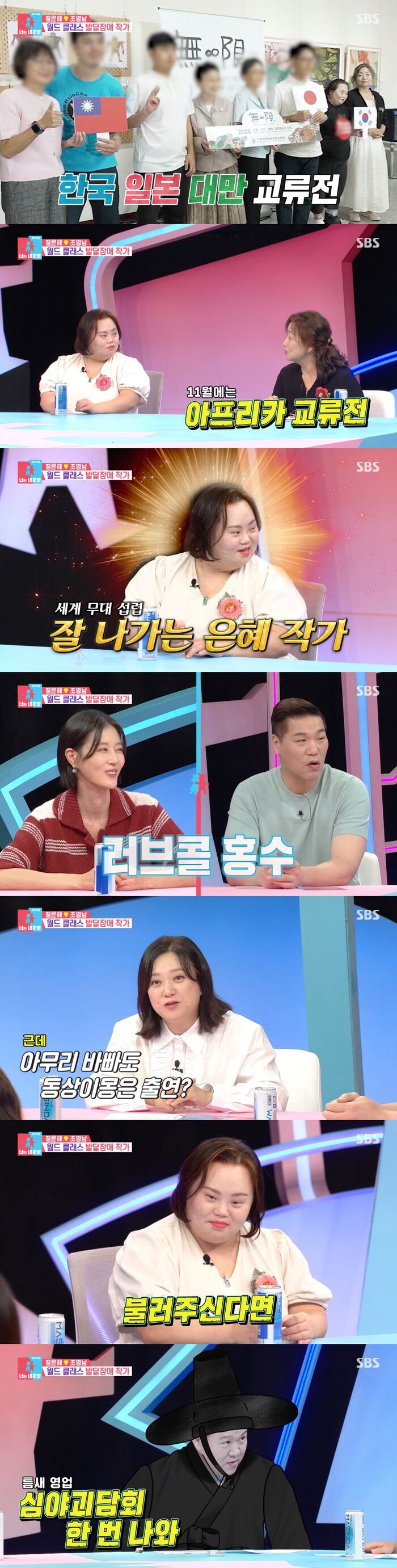 [SBS연예뉴스|김효정에디터]정은혜가바쁜근황속에서의리를뽐냈다.29일방송된SBS'동상이몽시즌2-너는내운명'(이하'동상이몽2')에서는정은혜조영남부부의일상이공개됐다.이날정은혜는바쁜근황을전했다.정은혜의어머니는방송후여러곳에서연락이쇄도하고있다고했다.이어그는"일본에서발달장애작가들과교류전을했다.11월에는아프리카교류전도있고개인전도준비하고있다"라고설명했다.그리고쏟아지는방송섭외는거절하고있다며"감사한일인데다감당을못하고있다"라고솔직하게말했다.이에김숙은"그래도동상이몽은나와주실거냐?"라고물었다.그러자정은혜는"네,불러주신다면"이라고의리를과시했다.이를보던김구라는"은혜씨심야괴담회한번나와"라고제안했고,김숙도함께"좋아하잖아"라며자신들의방송에출연을해달라고섭외를해웃음을자아냈다.Copyright©CopyrightⓒSBS.Allrightsreserved.무단전재,재배포및AI학습이용금지