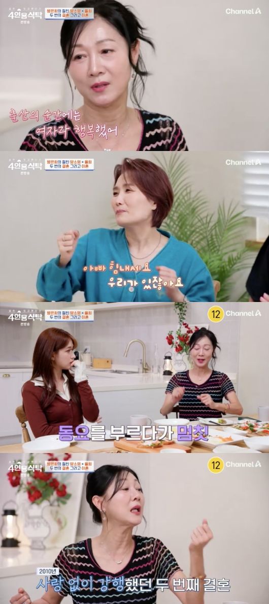 <방송시청후작성된리뷰기사입니다.>[OSEN=임혜영기자]방은희가아들에대한애정을드러냈다.29일방송된채널A‘절친토큐멘터리-4인용식탁’(이하4인용식탁)에는배우방은희가출연해절친으로전남편의회사소속걸그룹‘라붐’의멤버였던율희,그리고현재율희의양육권소송을담당하고있는양소영변호사를초대해이야기를나누었다.이날방은희는“아들은내존재의이유다.두번째결혼은정말안하려고했다.연애는해도결혼은한하려고했다"라고말문을연후"아들이3살때‘엄마,장난감가게에서아빠좀사다줘’하더라.정말(가슴이)미어진다.‘아빠힘내세요.우리가있잖아요’노래가있다.동요를부르다가순간멈칫한다.아빠를엄마로바꿔부르는데미친다"라며두번째결혼을결심하게된이유를밝혔다.이어"(두번째결혼은)사랑그런감정없이(상대가)엔터대표고강한사람이라고하니아이아빠가되어줄수있겠다싶었다”라고덧붙였다.그러나아이가없었던두번째남편은아이와함께하는방법을몰랐다고.이에방은희는다시한번이혼을결심했다고밝혔다.방은희는“너무어릴때연예인되는게싫다.(아들에게)노래도안들려줬다.(연예인은)똑똑한애들이하는것이다.내아이는평범했으면좋겠다.어느날소녀시대노래를부르더라"라고말한후"지금은보스턴에있는학교에다닌다.졸업작품부터세작품은그냥출연해주기로했다.내가매니저없이다니니아들이매니저역할도해준다”라고말하며아들자랑을멈추지않았다./[email protected][사진]채널A‘절친토큐멘터리-4인용식탁’Copyright©OSEN.무단전재및재배포금지.