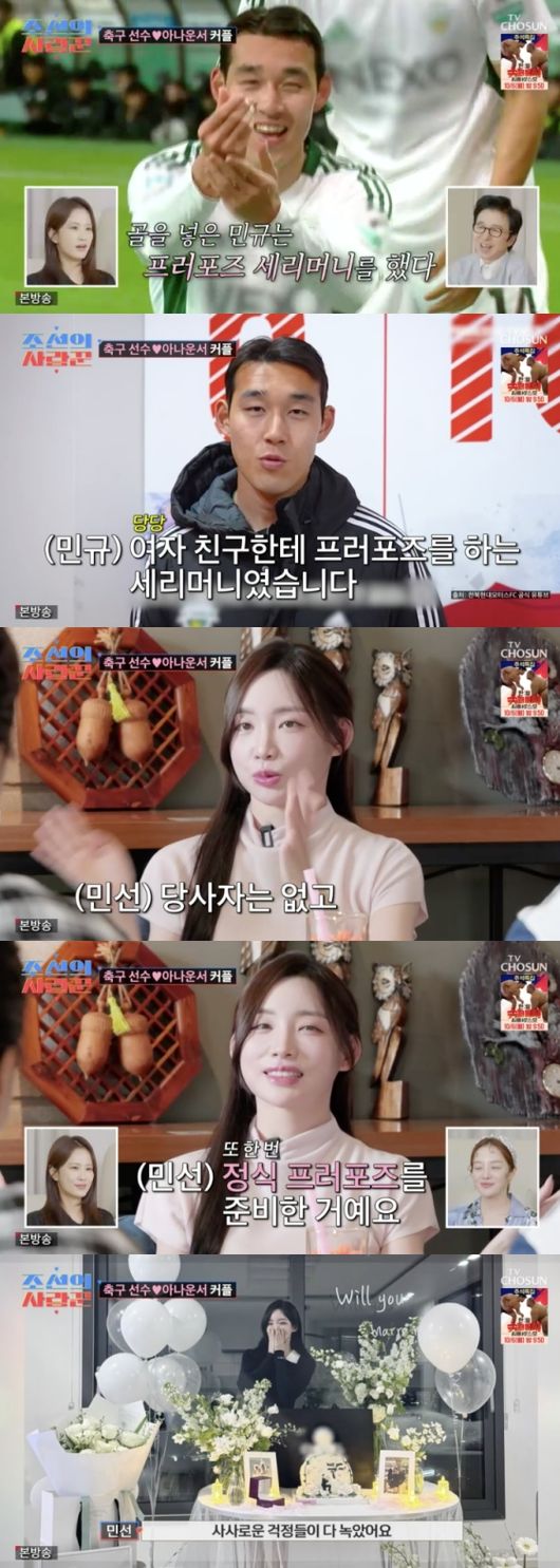 <방송시청후작성된리뷰기사입니다.>[OSEN=임혜영기자]송민규가프러포즈세리머니에대해설명했다.29일방송된TVCHOSUN극사실주의다큐예능‘조선의사랑꾼’에는송민규,곽민선예비부부의모습이그려졌다.송민규는지난5월경기에서프러포즈세리머니를했고,경기직후여자친구에게프러포즈를할것이라는인터뷰를했다.이에대해송민규는“프러포즈세리머니계획은혼자만하고있었다.진짜상상한대로됐다”라고말했다.곽민선은당시세리머리를직접못봤다며“당시에저는거기에없었다.방송하고있어서몰랐다.팬이‘누나결혼해요?’하더라.기사가났다고.회사와친구들전화가엄청와있었다”라고말했다.곽민선은“프러포즈세리머니다음날집에찾아갔는데당사자는없고꽃이가득했다.정식프러포즈를준비한것이다.그때그걸보고사사로운걱정들이다녹았다”라고말했다.곽민선은“내조해야겠다는생각이들었다.최대한전주에내려가서옆에서챙겨주려고노력하고있다”라고말했다./[email protected][사진]TVCHOSUN‘조선의사랑꾼’Copyright©OSEN.무단전재및재배포금지.