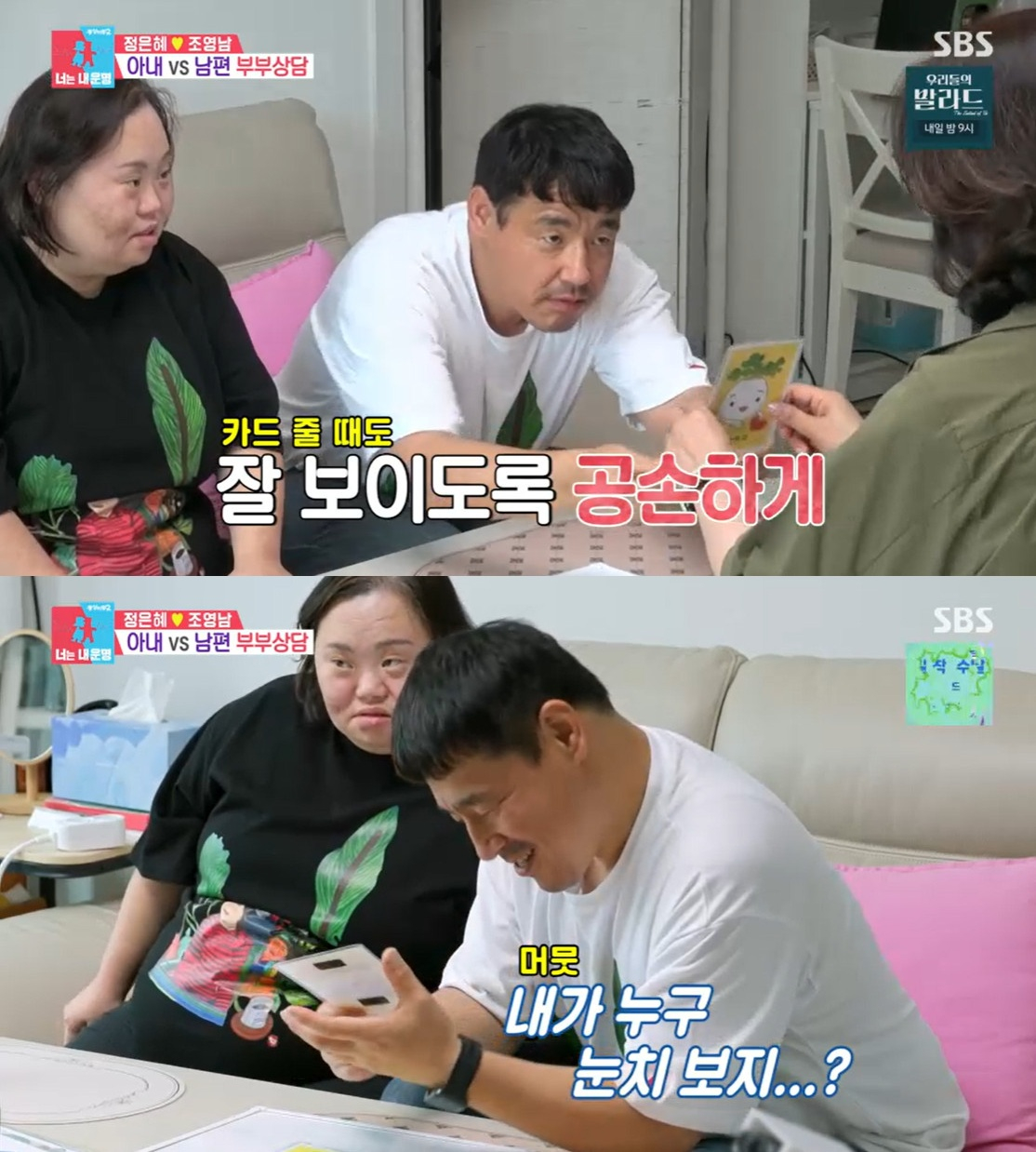 [스타뉴스|안윤지기자]/사진=SBS예능프로그램'동상이몽2-너는내운명'방송캡처'동상이몽2'배우겸작가정은혜의남편조영남이감정표현에어려움을느꼈다.29일방송된SBS예능프로그램'동상이몽2-너는내운명'에서는정은혜,조영남부부의일상이그려졌다.이날성교육선생님이와서부부상담을시작했다.정은혜는먼저'속상하다'카드선택했다.그는"사람들이많이들어올때날그렇게말한다.'은혜씨,피곤하냐.힘드냐.사인하느라팔이아프겠다'라고묻는다.그말이속상하다.대단하다,멋있다,그림잘그린다라는말을듣고싶다"라고털어놨다.조영남은긍정카드로'배려하다'를선택했다.그는"배려하는게좋다.아끼는부인을배려하고싶다"라고말해감탄사를자아냈다.이에김구라는"좋은신랑이다.항상아내먼저생각한다"라고했고정은혜의모친도"부럽다"라고말해웃음을자아냈다.그는부정카드로'눈치보다'선택했지만별다른답변을하지못했다.정은혜는"매일오빠가(눈치를)보는거같다.하지만왜그런지안물어봤다"라고했다.정은혜의모친은"영남씨가더그런거같은데거절을잘못한다.자꾸긍정적인말만하면힘들어진다"라고걱정했다.한편'동상이몽2'는매주월요일오후10시10분방송된다.안윤지기자[email protected]©스타뉴스&starnewskorea.com,무단전재및재배포금지